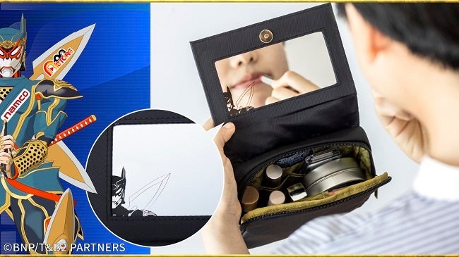 サッと身だしなみを確認できるミラーには、見切れ職人「折紙サイクロン」が見切れています。ふたが、がばっと開く構造で、鏡を見ながらでも片手で中身が取り出しやすいのがポイントです。内生地は中身が確認しやすい明るい色に、ワイルドタイガーとバーナビー・ブルックス Jr.のシルエットが総柄でデザインされています。