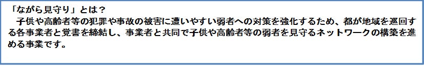 日常業務を行いながら、子供や高齢者等の弱者を見守ってもらうことで、安全に安心して暮らせる地域づくりに取り組んでいきます。