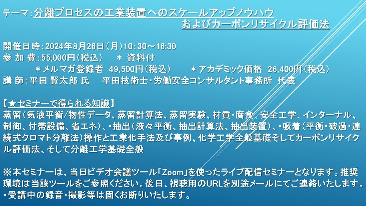 【ライブ配信セミナー】分離プロセスの工業装置へのスケールアップノウハウおよびカーボンリサイクル評価法 8月26日(月)開催 主催:(株)シーエムシー・リサーチ