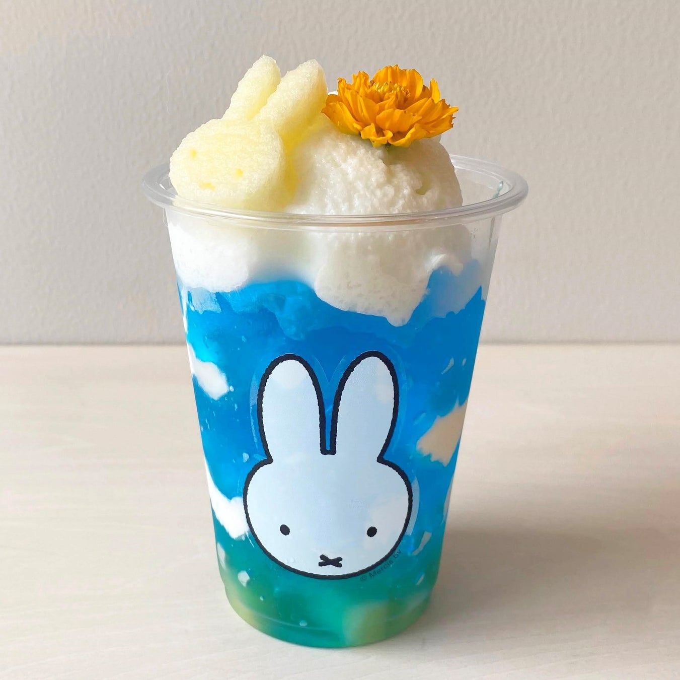 ポップアップショップ期間限定で横浜店のテイクアウトメニューに登場するシュワシュワ感あるソーダゼリーの青空にヨーグルトムースの雲が浮かぶ、見た目も味も爽やかなスイーツです。ミッフィーを模ったリンゴのトッピングのほか、青空ゼリーの下にもパイナップルが入っていて食べ応えも抜群です。溶けにくいので持ち歩きも楽しめます。