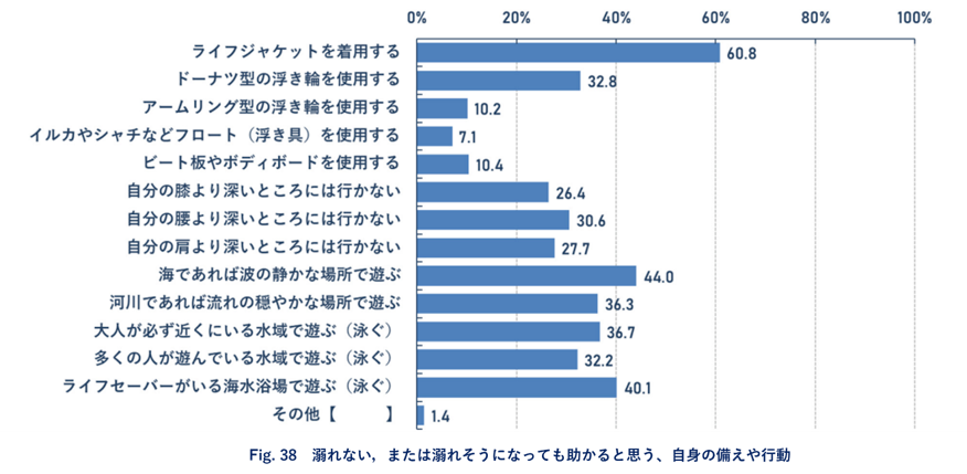 ・「溺れない、溺れそうになっても助かるためのそなえや行動」について、約6割が「ライフジャケットの着用」と回答