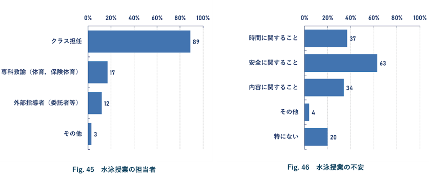 ・水泳授業は、小学校では89%がクラス担任が担当し、「安全に関すること」に対して大きく不安を感じている