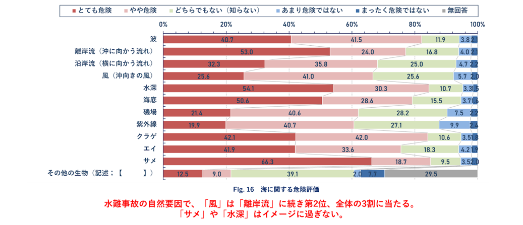 ・あなたが考える海に関する危険を評価してくださいという問いに対して、「とても危険」の評価に「サメ」「水深」が上位。水難事故の主要因の「風」を「とても危険」と評価していない人が多い