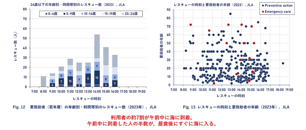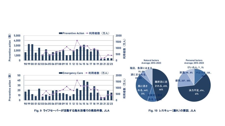 ・約200の主要海水浴場で毎シーズン2000〜3000の救助が発生。自然要因は離岸流・風。個人要因は泳力不足・疲労・パニック