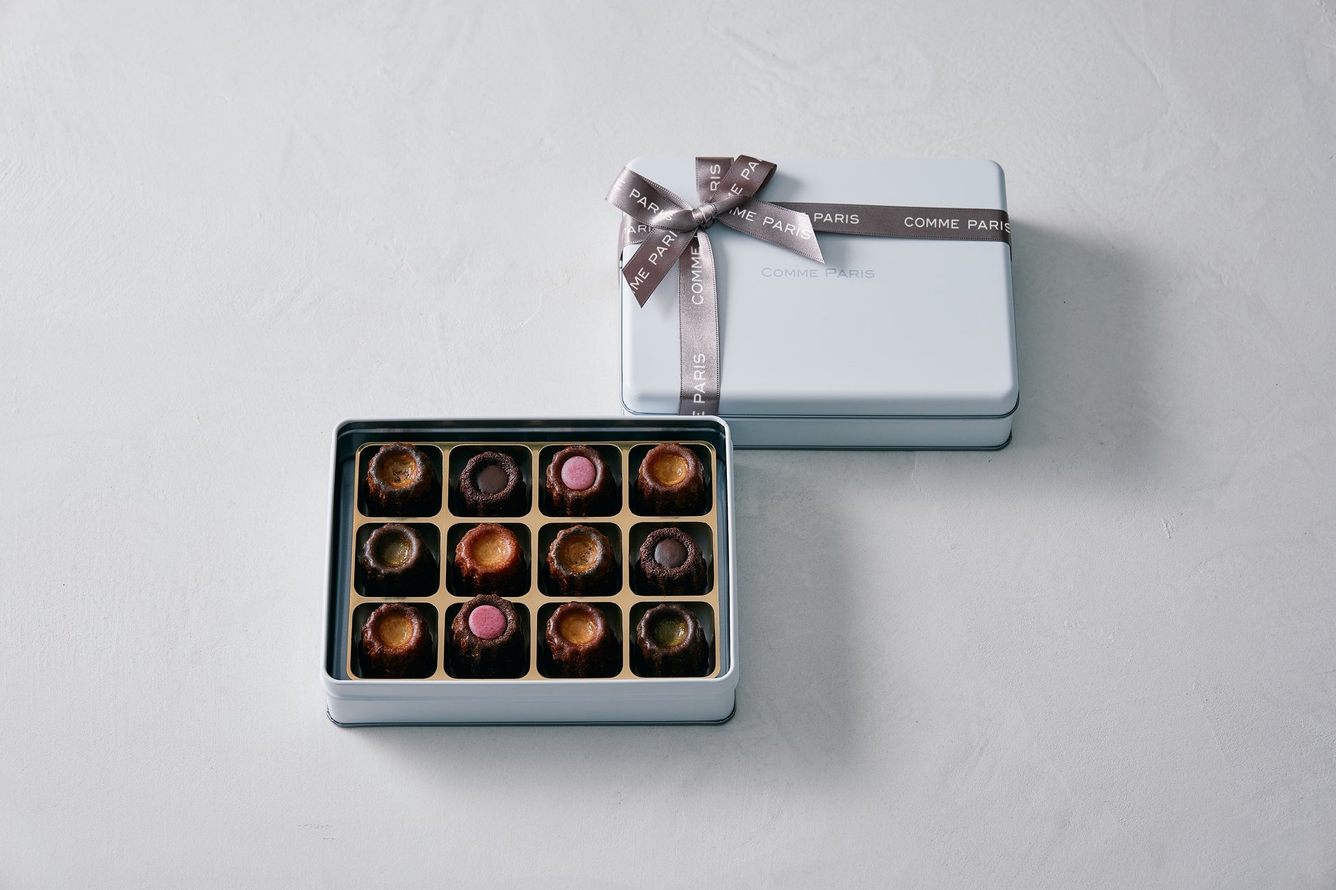 <コムパリ>で一番人気の「Première」を期間限定仕様でお届けします。新登場のフォンダンショコラと4種類のカヌレを味わえる宝石箱のような詰め合わせです。