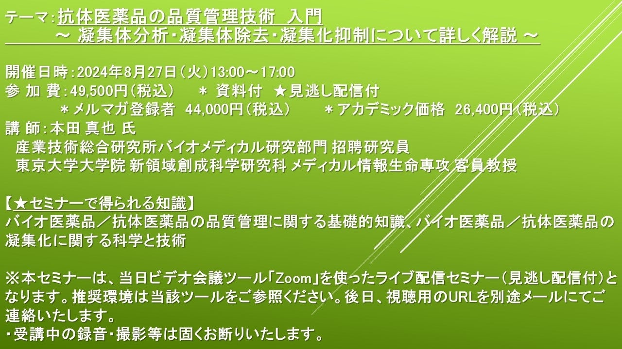 【ライブ配信セミナー】抗体医薬品の品質管理技術 入門 ~ 凝集体分析・凝集体除去・凝集化抑制について詳しく解説 ~ 8月27日(火)開催 主催:(株)シーエムシー・リサーチ