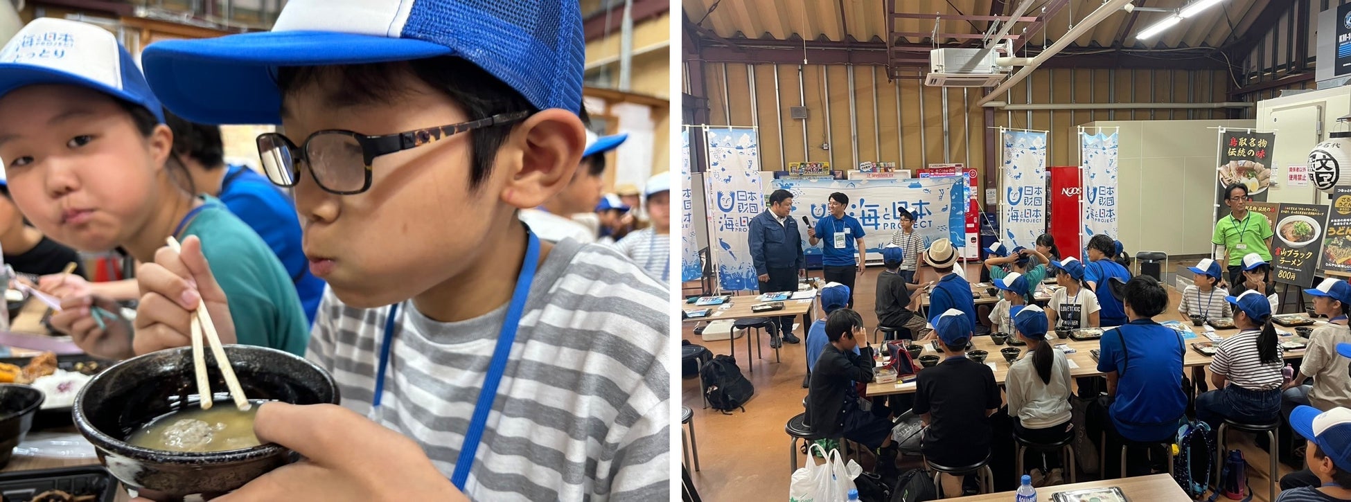 続いて鳥取市の水産物直売所「かろいち」に移動し、お昼ごはんです。お弁当とともに児童たちに振舞われたのが、山陰では「アゴ」と呼ばれるトビウオを使ったつみれ汁です。児童の中には何杯もおかわりをする児童もいて、今が旬の日本海の味覚を堪能していました。