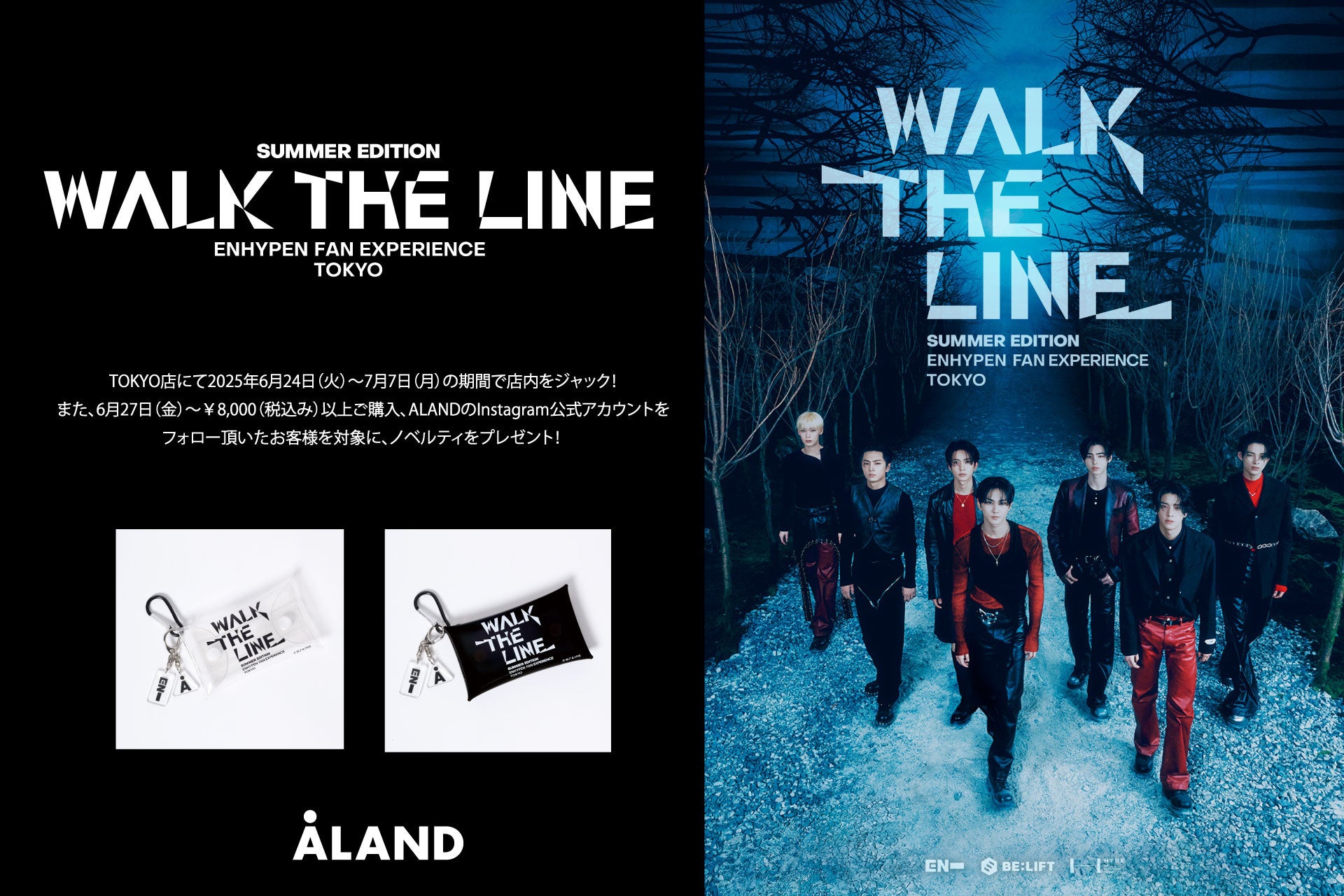 株式会社アダストリア(本部:東京都渋谷区渋谷2-21-1、代表取締役社長:木村 治)が展開する韓国発のセレクトブランドALAND(エーランド)は、韓国の新進デザイナーとサブカルチャーを発掘し、その価値を最も魅力的な手法でマーケットに発信する唯一のライフスタイル型セレクトショップです。2020年にデビューした7人組グローバルグループ「ENHYPEN」が行うワールドツアーの日本公演『ENHYPEN WORLD TOUR ‘WALK THE LINE’ IN JAPAN -SUMMER EDITION-』にあわせて、2都市で開催されるコンサート連動型プロジェクト「ENHYPEN WORLD TOUR ‘WALK THE LINE’ IN JAPAN -SUMMER EDITION-:Fan Experience TOKYO」への参画が決定いたしました。ALAND TOKYO店にて2025年6月24日(火)~2025年7月7日(月)に、店内ジャック企画を実施いたします。また、2025年6月27日(金)からは税込み8,000円以上ご購入の上、ALANDのInstagram公式アカウントをフォロー頂いたお客さまを対象にノベルティをプレゼントいたします。