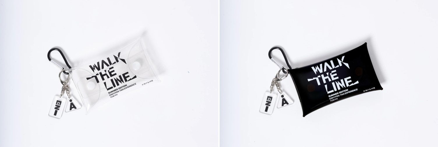 配布物:ENHYPEN と ALAND ロゴのアクリルキーリングがついたカラビナ付きクリアポーチ(ブラックもしくはホワ イト)