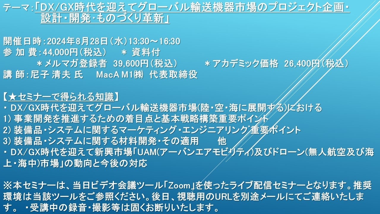 【ライブ配信セミナー】「DX/GX時代を迎えてグローバル輸送機器市場のプロジェクト企画・設計・開発・ものづくり革新」 8月28日(水)開催 主催:(株)シーエムシー・リサーチ