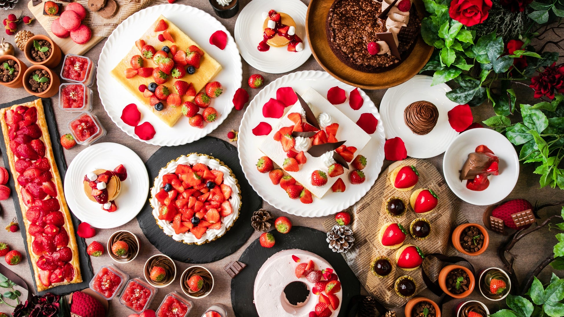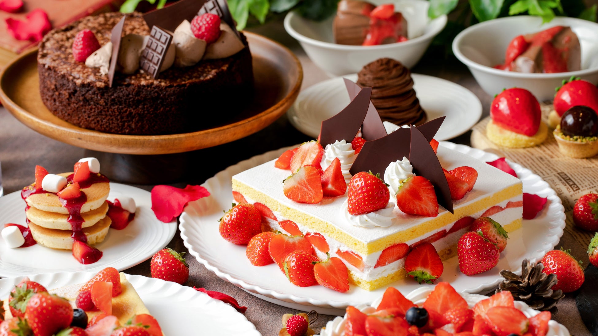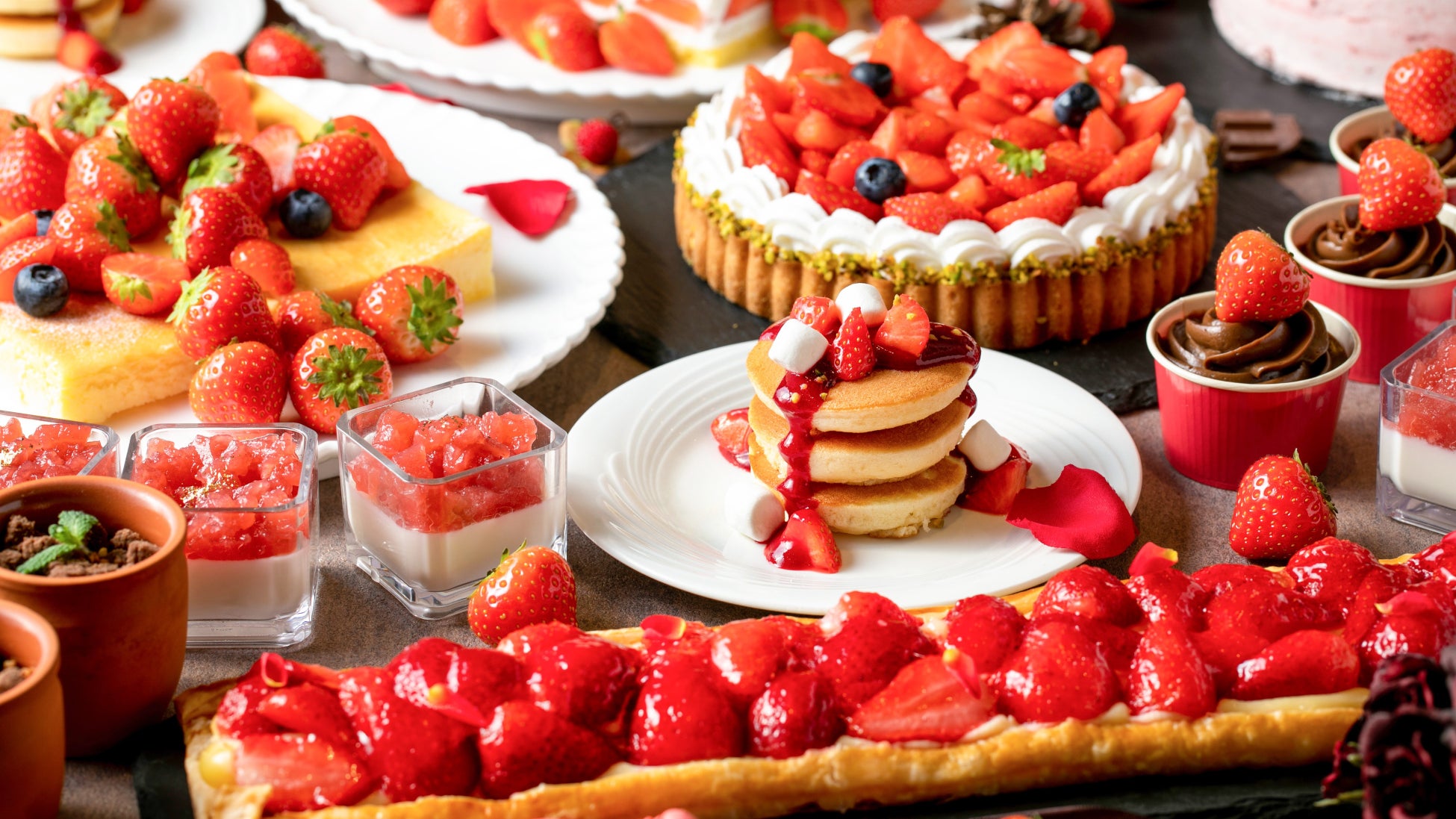 旬の苺を使用したスイーツブッフェでは、不動の人気を誇る、いちごのショートケーキやタルトのほか、ショコラモンブランやガトーショコラなどのスイーツメニュー21種類とそのほか、オードブルやパスタの各種お食事メニューをご用意いたします。