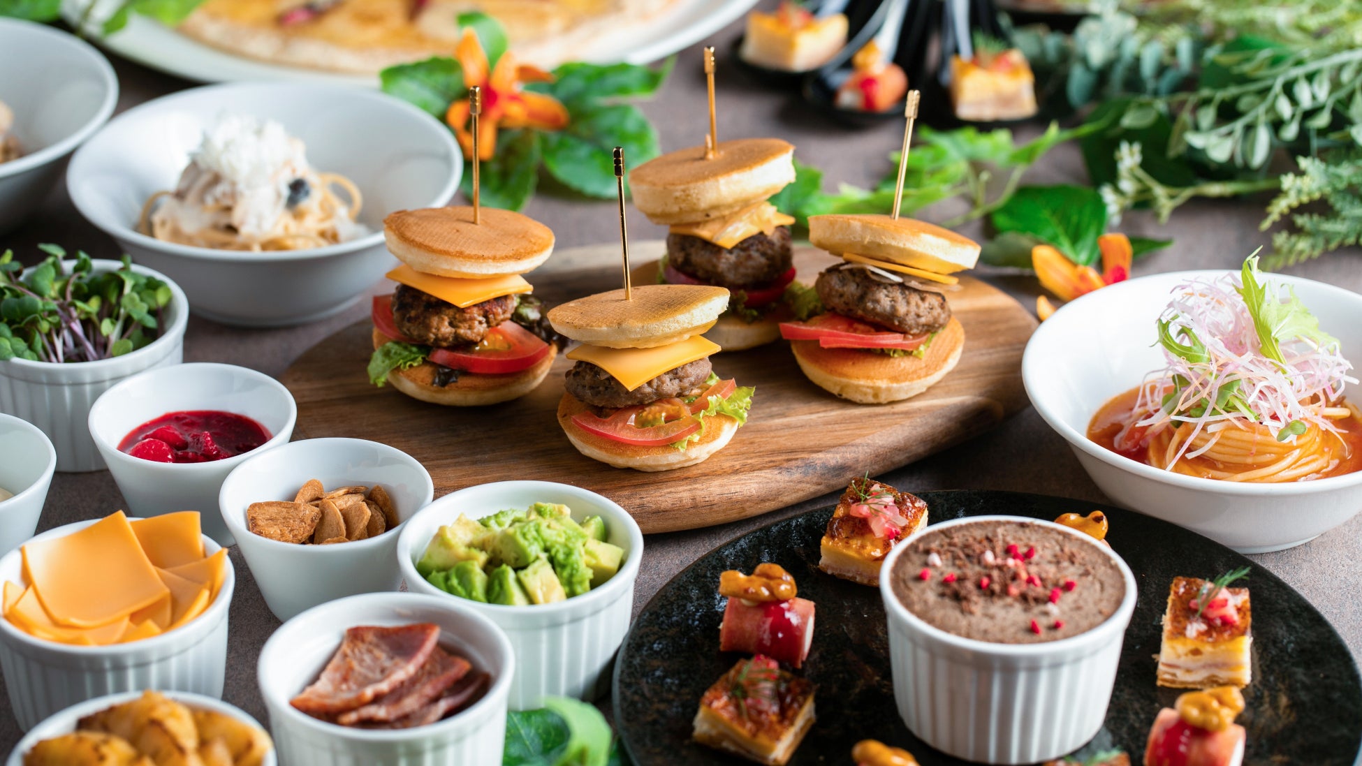 “パンケーキバーガー”は、アボカドやチーズ、ベーコンなど8種類のトッピングをご用意、自分好みのオリジナルバーガーを何度でもお楽しみいただけるブッフェの醍醐味を体験いただけます。