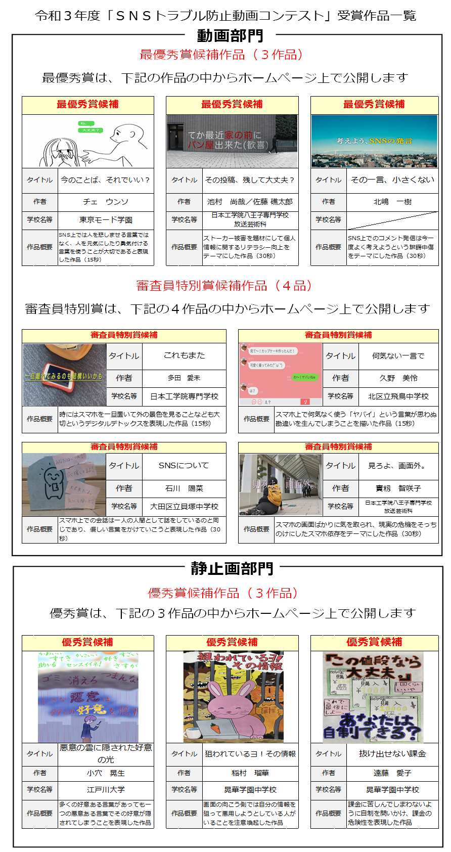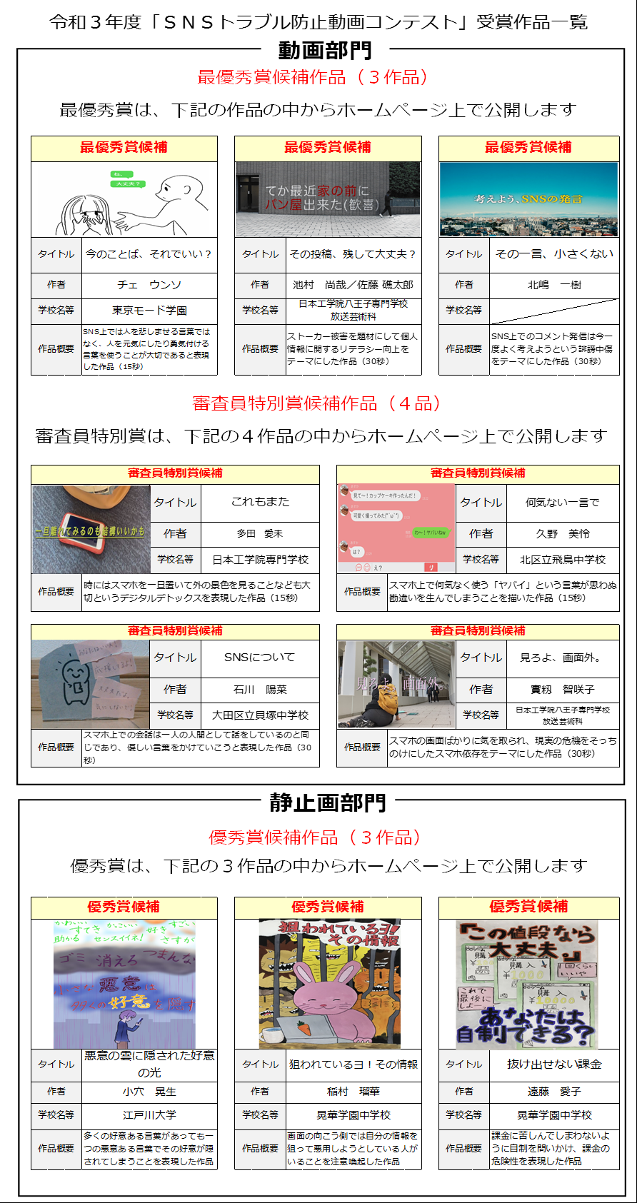 東京都では、「スマホでSNSを使うときに気を付けたいこと」をテーマとする作品(動画及び静止画)を募集するSNSトラブル防止動画コンテストを開催しました。