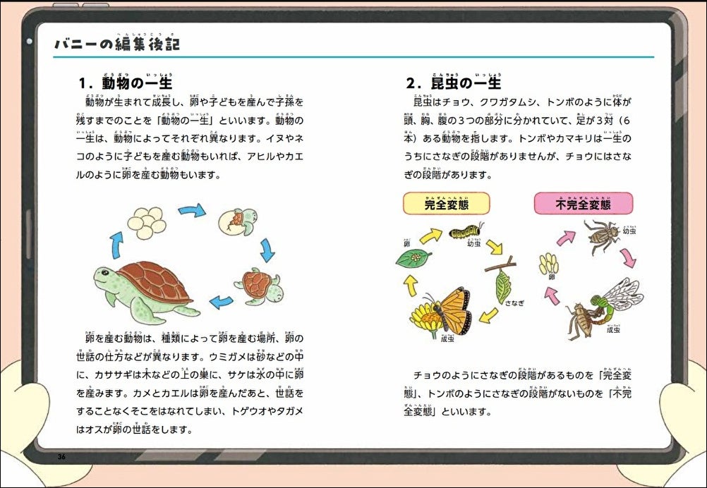 さらに毎話の最後には、「バニーの編集後記」としてその章のメインとなるテーマの知識をまとめて紹介。1巻では動物の誕生・生物の特徴と分類・環境について、2巻では磁石の性質・光の性質・電流の働きについて学ぶことができ、日本の小学校中学年の理科で習う単元のサポートとしても活用できます。