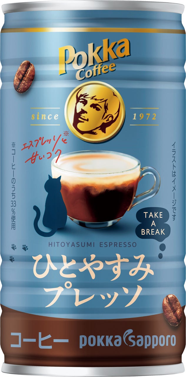 新商品「ポッカコーヒーひとやすみプレッソ」は、エスプレッソ抽出コーヒー(※)を使用したほろ苦さと砂糖の甘さによるコクに加え、猫が描かれた愛らしいパッケージデザインで“ひとやすみ専用”の商品となっています。
