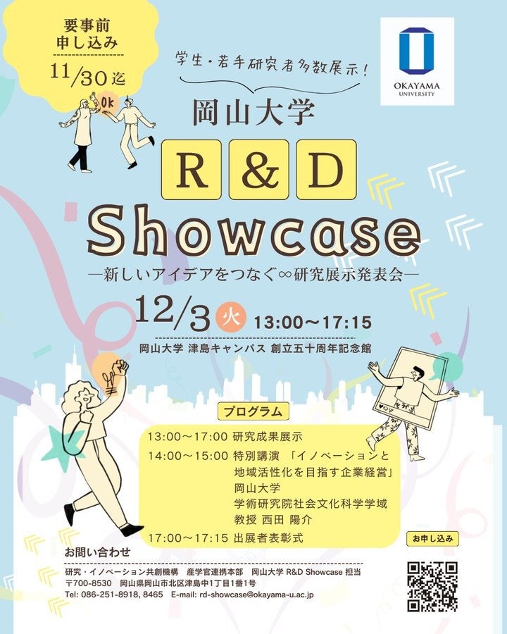 【岡山大学】研究者と学生による説明×研究成果の実物展示で次世代技術を体感!「岡山大学 R&D Showcase」〔12/3,火 岡山大学津島キャンパス〕