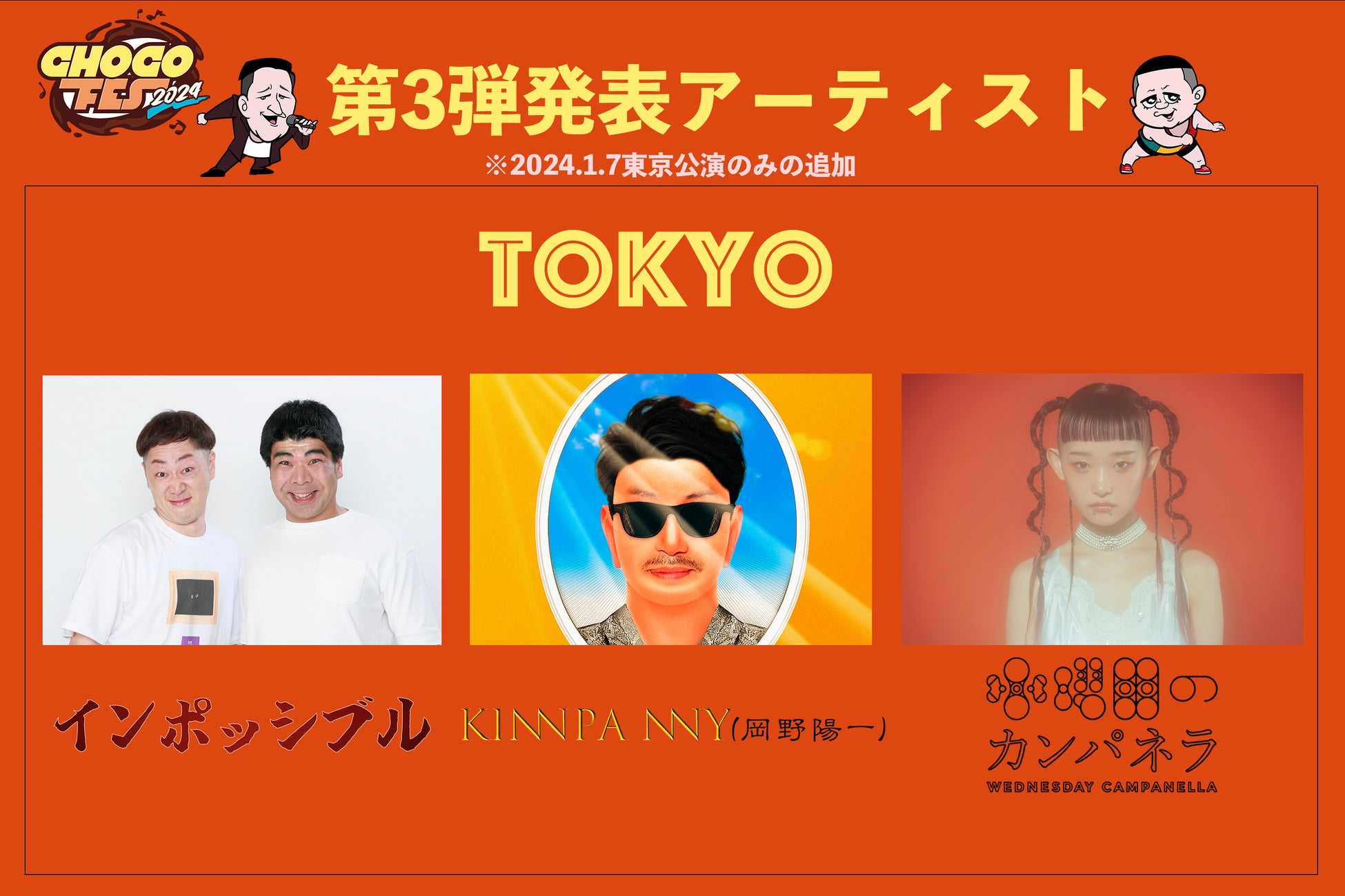 今回ゲスト出演最後の発表となる第3弾アーティストは、チョコプラが可愛がっている“先輩“としても知られている芸歴18年目のお笑いコンビ「インポッシブル」に、松平健がカバーしたことで話題になったパンダピラニアの元ネタ「Panda Piranha」を歌うKinnpa nny(岡野陽一)が急遽架空の国イベンギから緊急来日(?)。さらに、日本武道館公演開催も決まった話題の音楽ユニット「水曜日のカンパネラ」も出演することが決定いたしました。