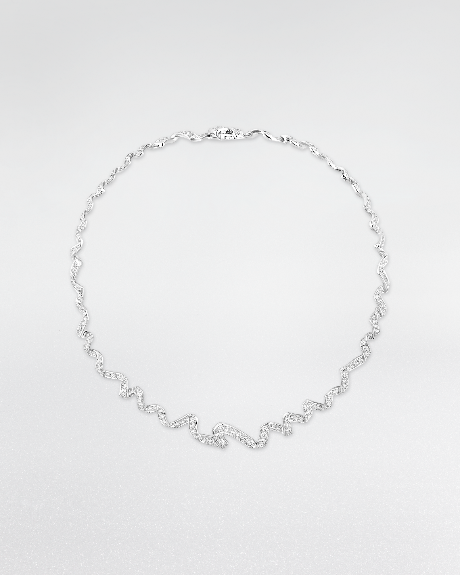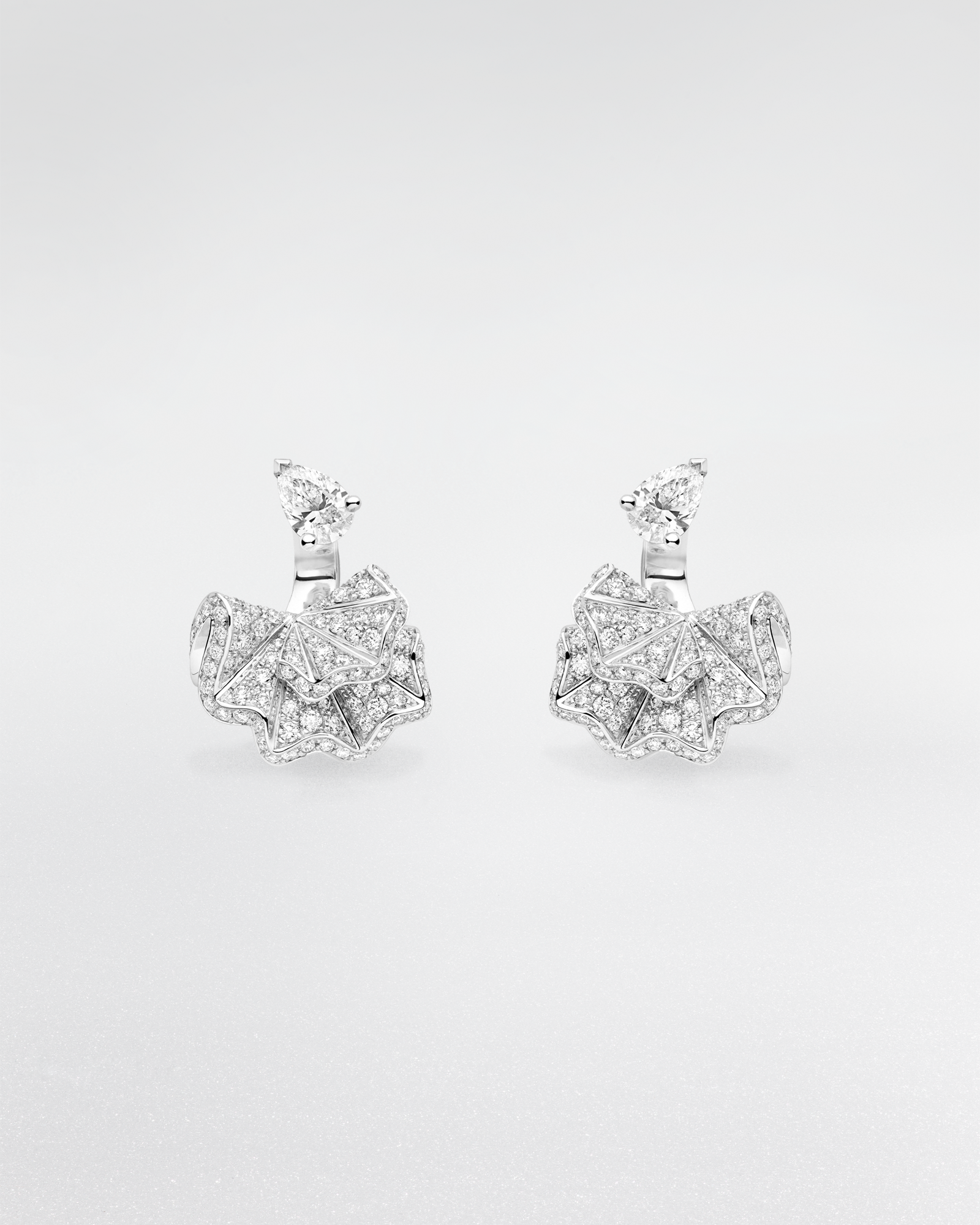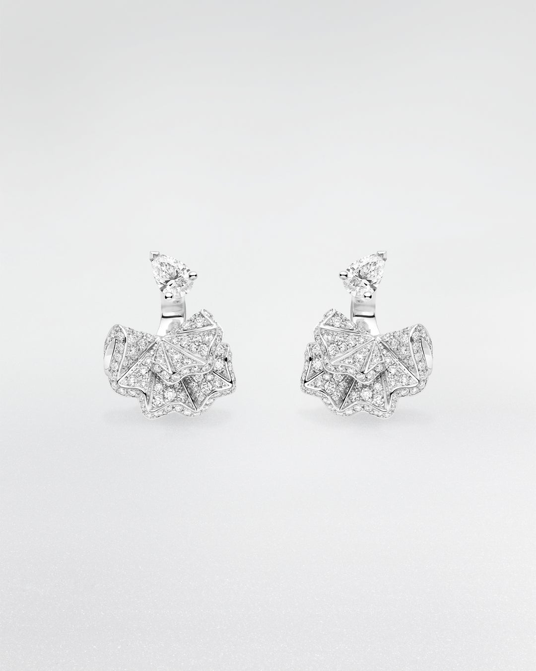 ミア・ゴスは、ホワイトゴールドにダイヤモンドをあしらった「クチュール ディオール」ネックレスとイヤリングを着用しました。