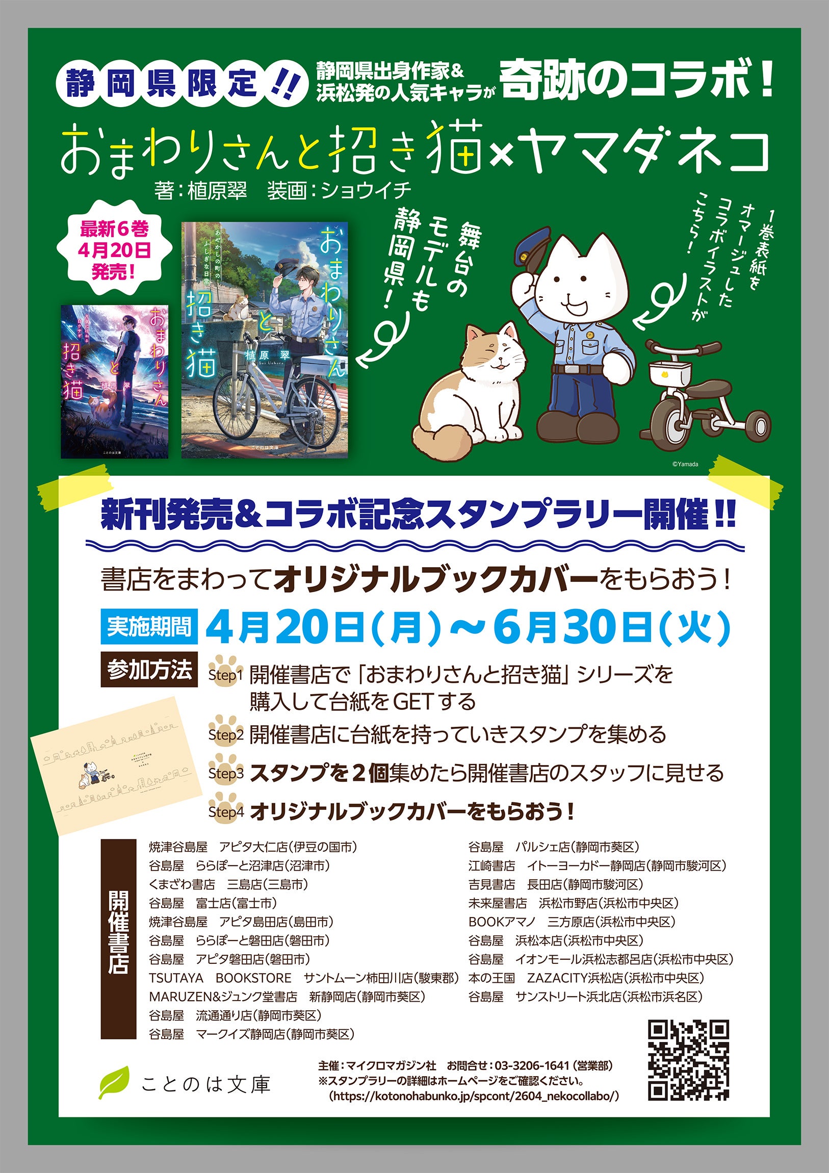 舞台のモデルとなっている静岡県の一部書店にて、ブックカバーがもらえるスタンプラリー施策が展開。さらに、東海エリアの協力書店限定では「おまわりさんと招き猫」シリーズを1冊ご購入ごとに、浜松発の人気キャラ・ヤマダネコ コラボイラストを使用した特製しおり(全2種)を1枚プレゼントいたします!