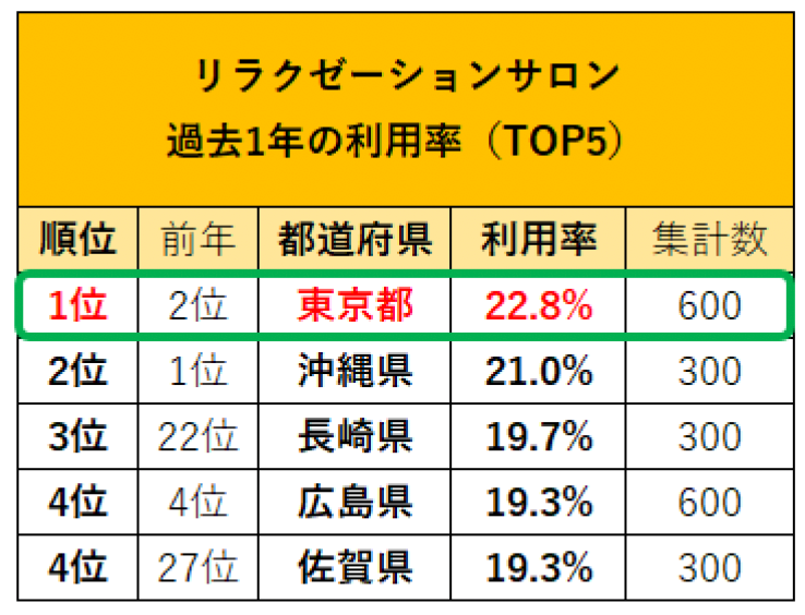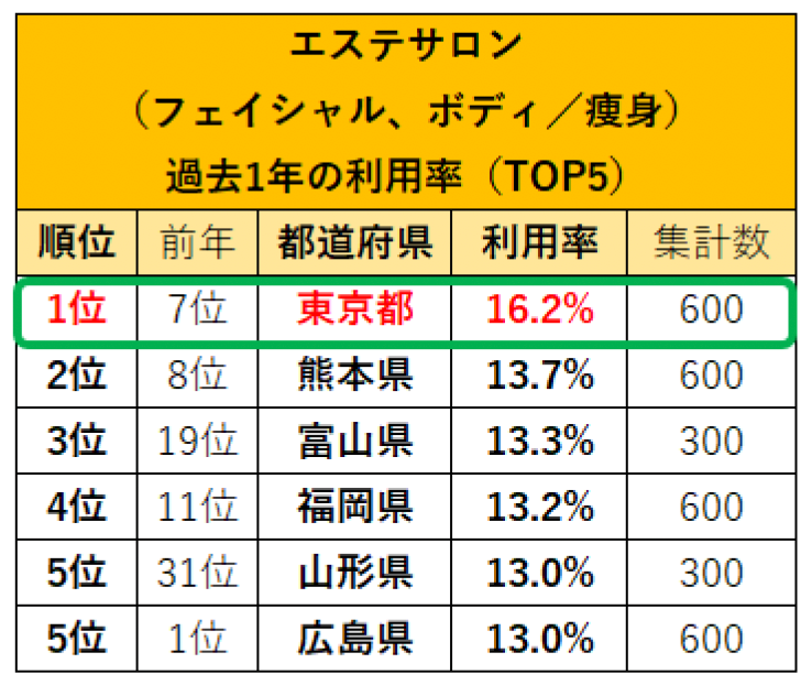 ネイルサロン、エステサロン(フェイシャル、ボディ/痩身)、リラクゼーションサロン、アイビューティーサロンの全てにおいて利用率の1位は東京都に!