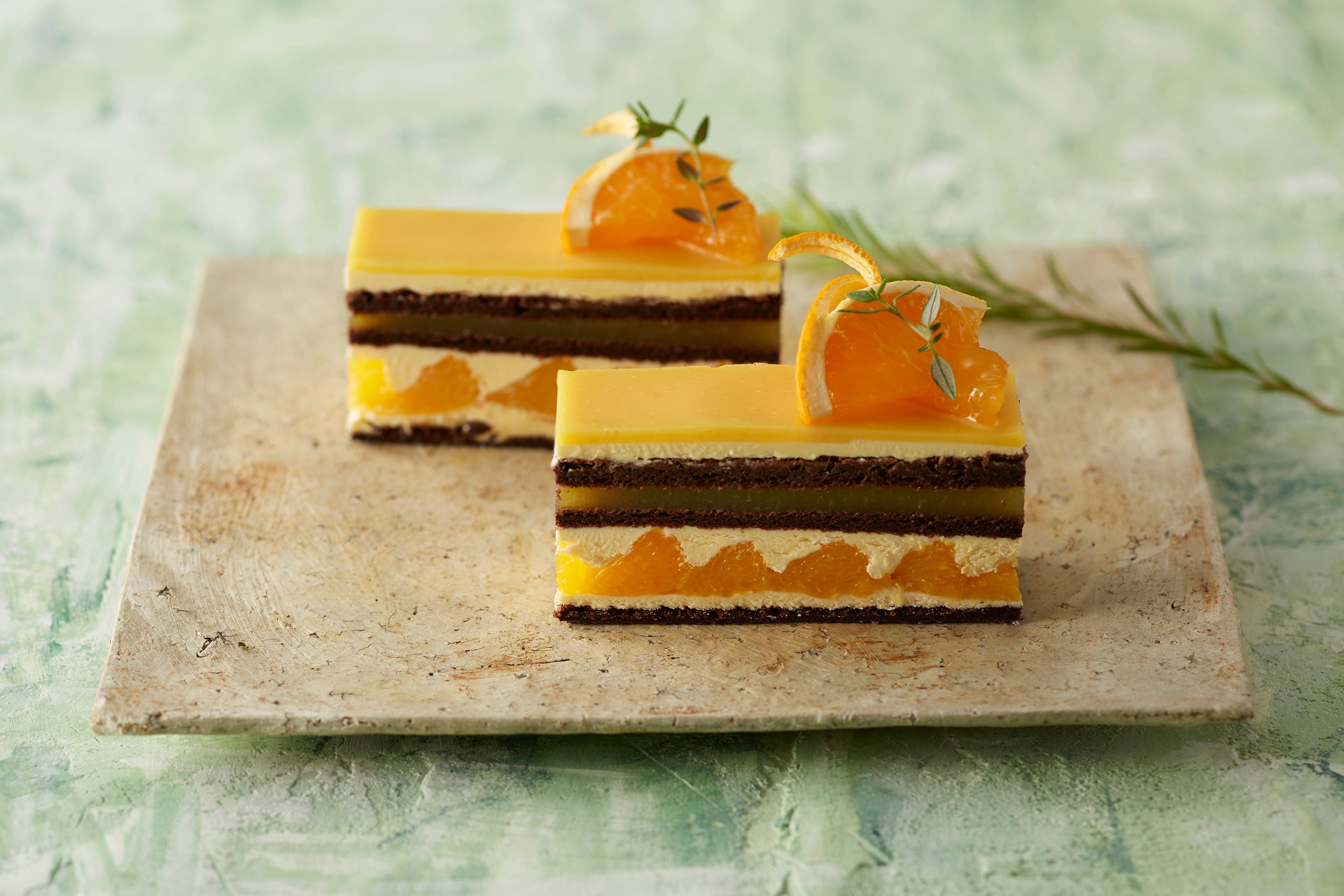 オレンジを練りこんだバタークリームとチョコレート生地をベースに、オレンジ風味のグラサージュで仕上げました。サクサクとした食感に、爽やかなオレンジの酸味とバタークリームの甘さを合わせた一品です。