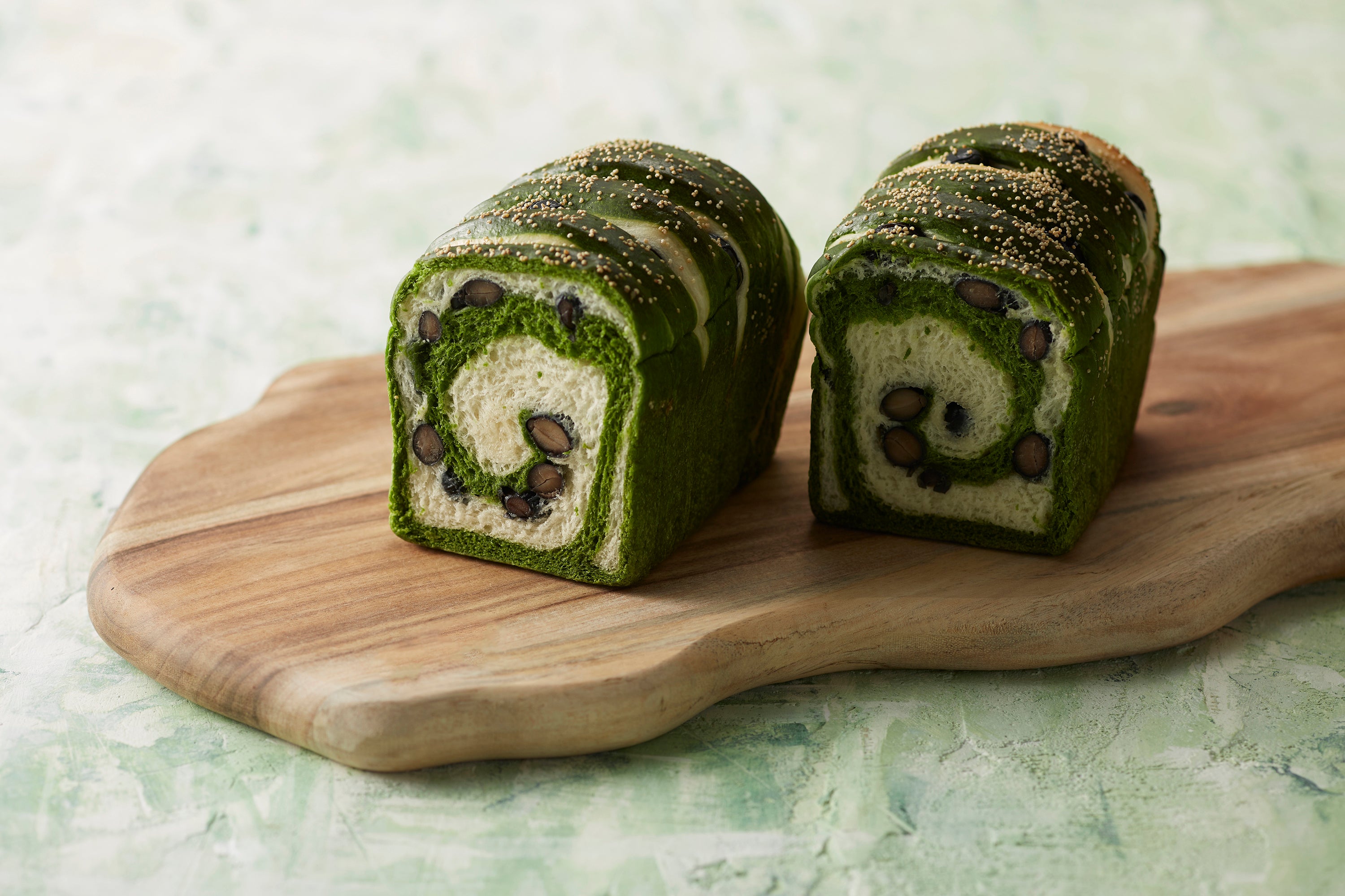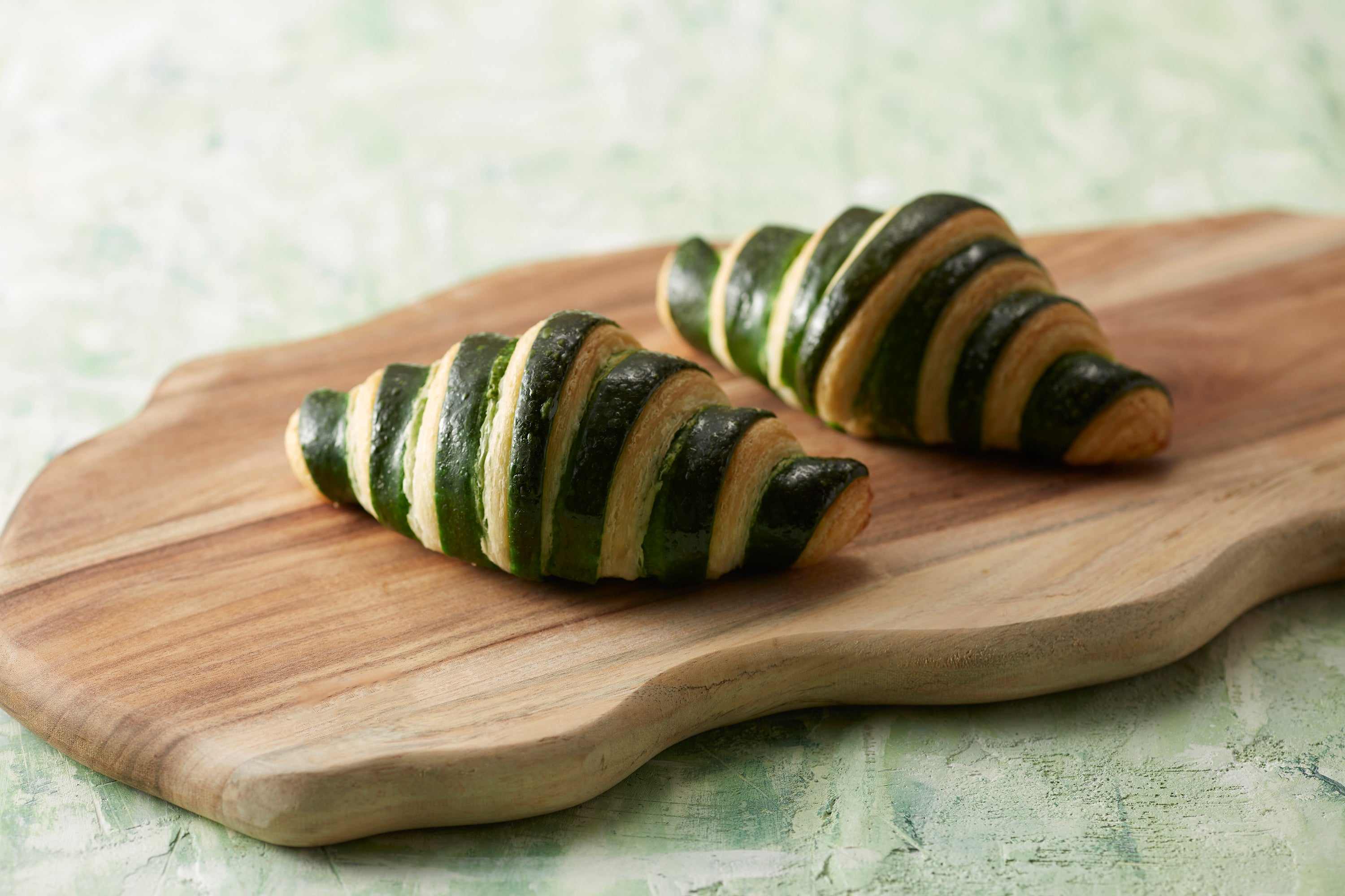 ベーカリー商品の「Thé vert(テ・ヴェール)」はフランス語で“緑茶”を意味しており、クロワッサンの生地と抹茶を練り込んだ生地を重ねました。鮮やかな2層の色味が見た目にも美しく、軽食にもティータイムにもぴったりな一品です。