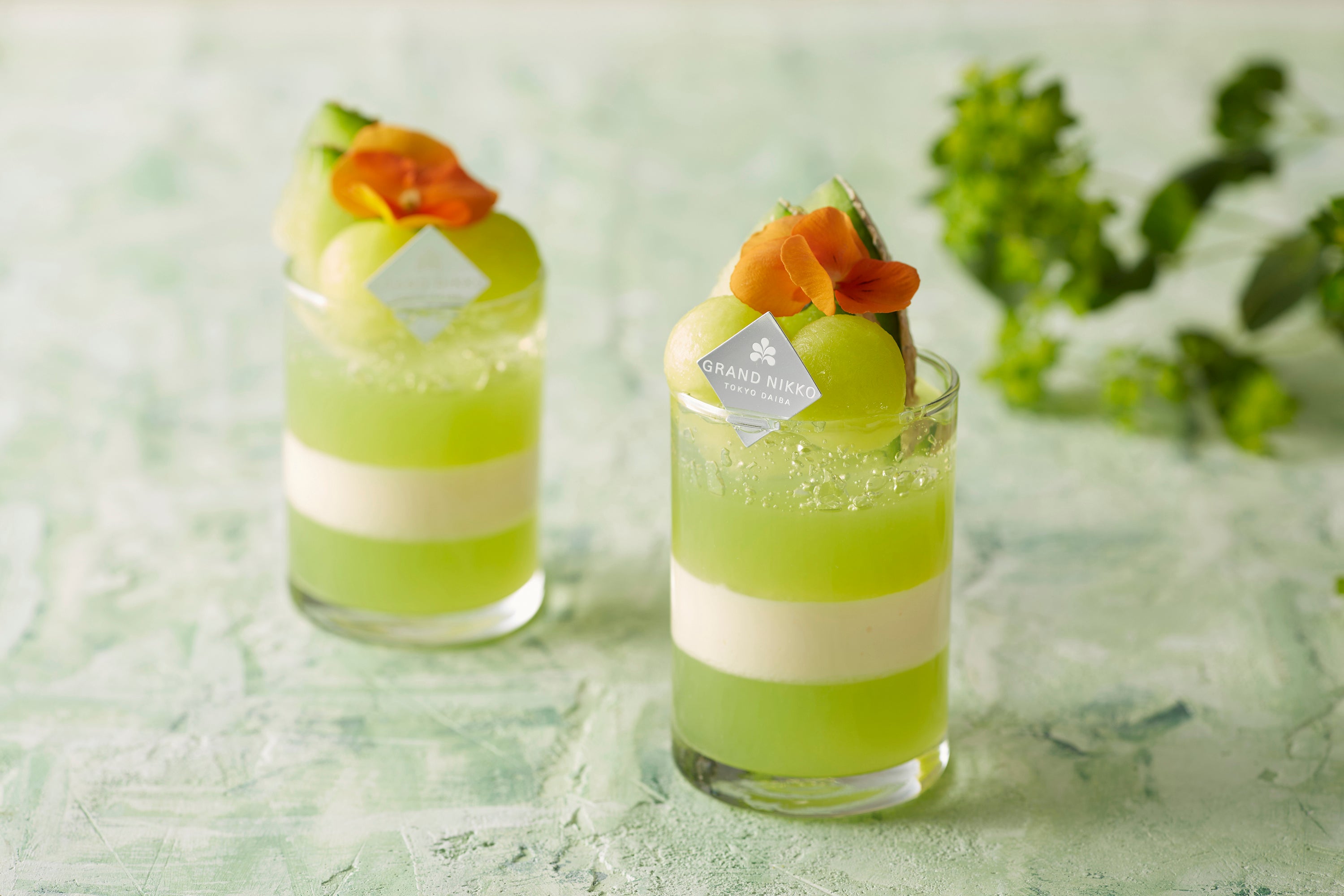 ヨーグルトのババロアにメロンのジュレを重ねました。トップには青肉メロンとココナツのジュレをあしらっており、ヨーグルトの酸味とメロンの甘みが合わさった一品です。
