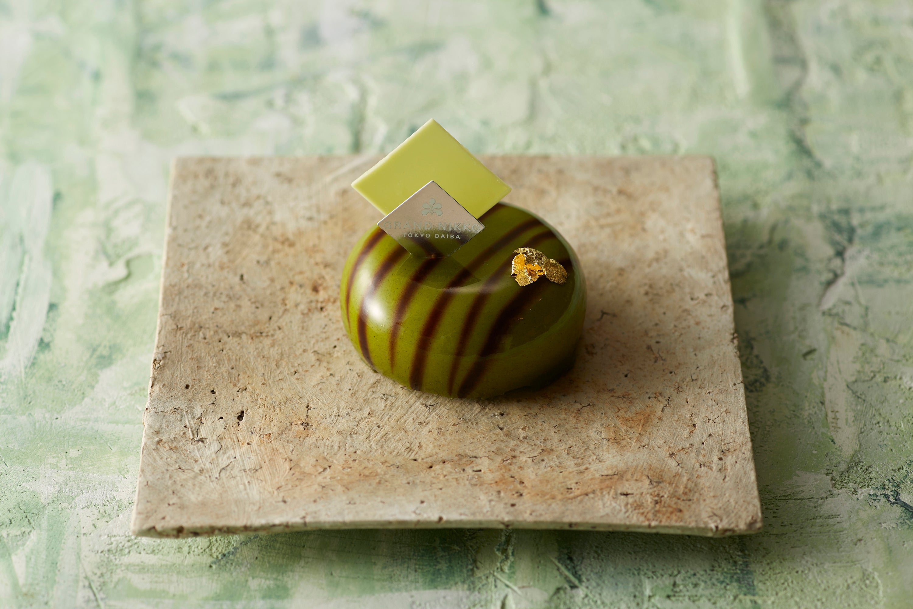 アーモンド生地に、抹茶のムース、バニラのババロアと柚子のジュレを重ねました。抹茶の鮮やかな緑色と豊かな香りを存分にお楽しみください。
