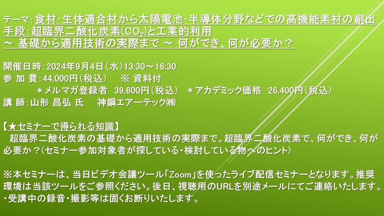 【ライブ配信セミナー】食材・生体適合材から太陽電池・半導体分野などでの高機能素材の創出手段:超臨界二酸化炭素(CO2)と工業的利用 9月4日(水)開催 主催:(株)シーエムシー・リサーチ