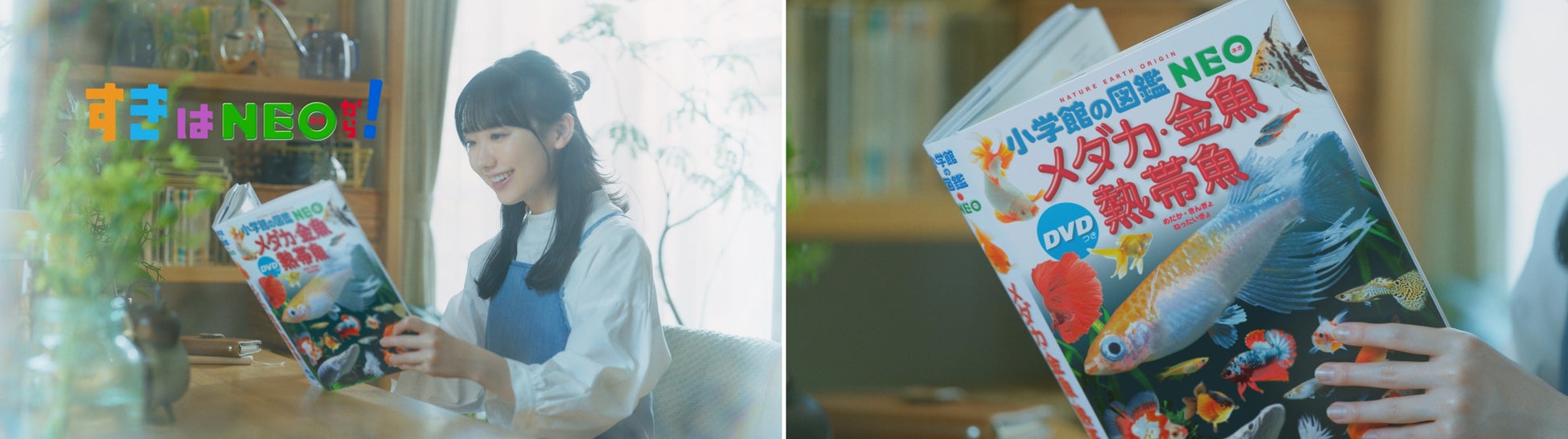 今までの図鑑NEOでは見せなかった、大人っぽい新ビジュアルは必見です。また、メダカ目線で図鑑NEOを楽しむ芦田さんを描いた新CMでは、メダカ役を人気声優のチョーさんが熱演。初共演となるふたりの掛け合いにもご注目ください。
