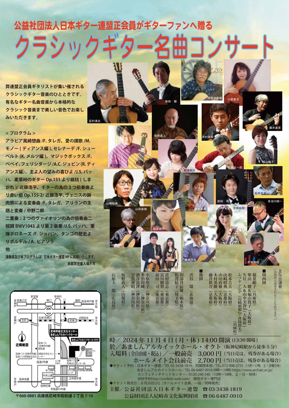公益社団法人日本ギター連盟主催、『クラシックギター名曲コンサート』が2024年11月4日(月・祝)にあましんアルカイックホール・オクト(兵庫県尼崎市昭和通2丁目7-16)にて開催されます。チケットはカンフェティ(運営:ロングランプランニング株式会社、東京都新宿区、代表取締役:榑松 大剛)にて発売中です。