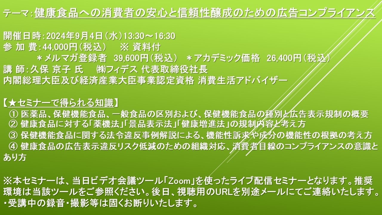 【ライブ配信セミナー】健康食品への消費者の安心と信頼性醸成のための広告コンプライアンス 9月4日(水)開催 主催:(株)シーエムシー・リサーチ