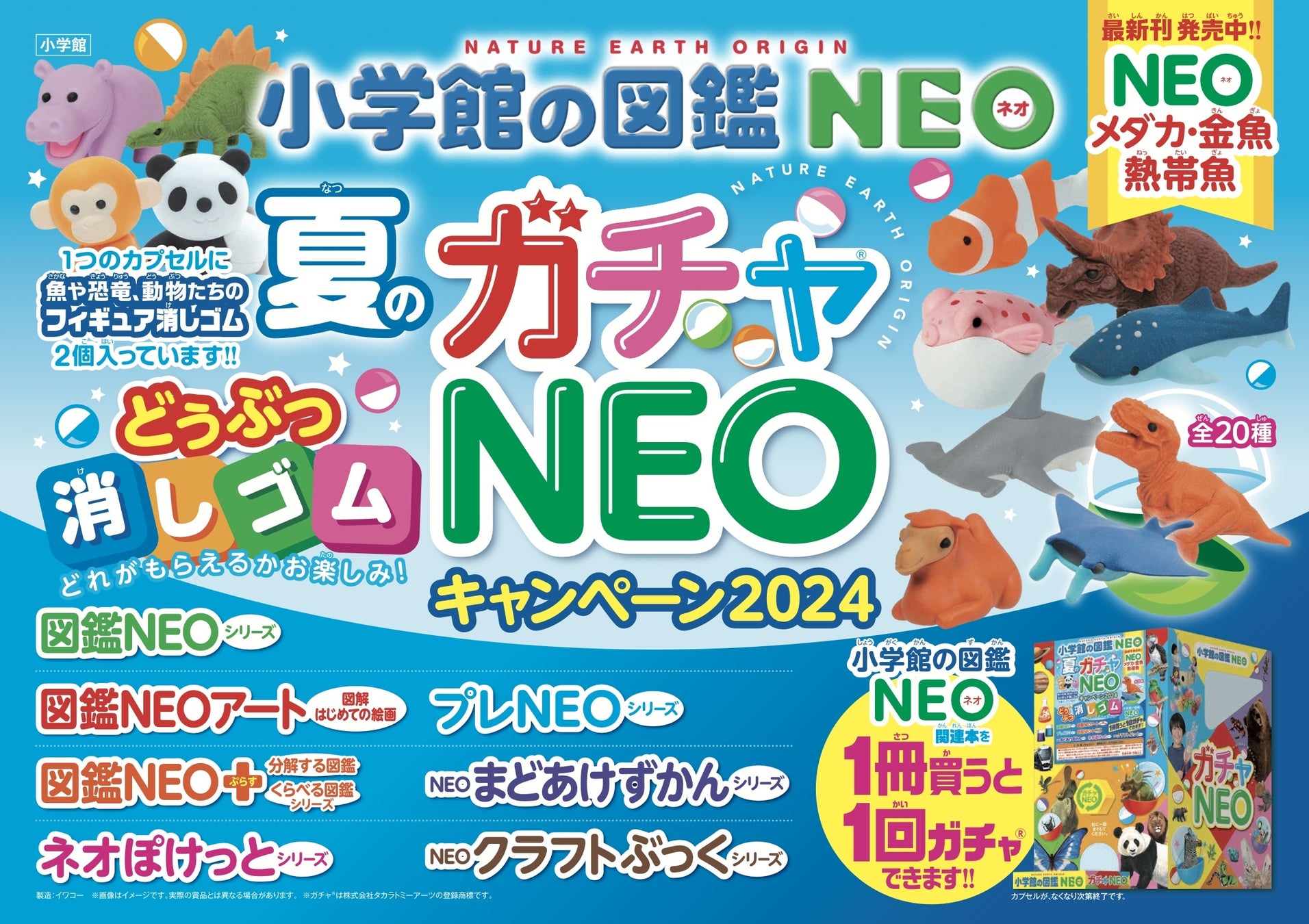 書店店頭にて『小学館の図鑑NEO メダカ・金魚・熱帯魚』を含む図鑑NEOシリーズを購入すると、ガチャ®が1回できる『夏のガチャNEOキャンペーン2024』を6月25日よりスタート。第1弾ガチャでは、子どもに人気の恐竜や動物、海の生物を含む「どうぶつ消しゴム」(全20種)が2個セットでもらえます。また、7月末ごろには第2弾ガチャもスタート予定。