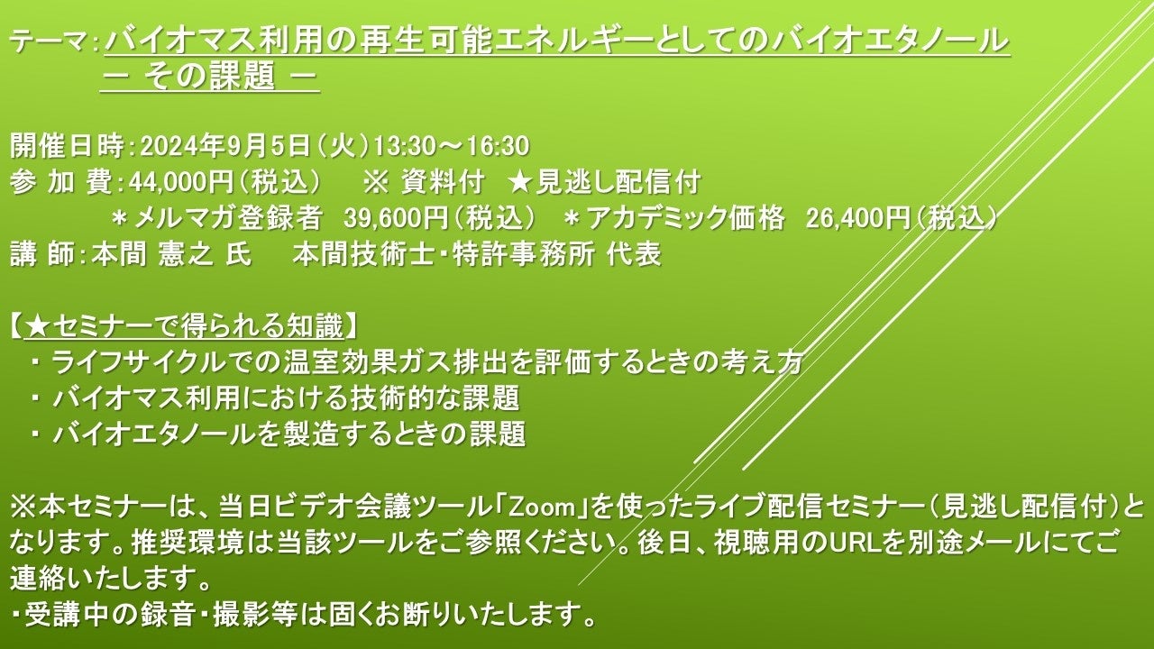 【ライブ配信セミナー】バイオマス利用の再生可能エネルギーとしてのバイオエタノール - その課題 - 9月5日(火)開催 主催:(株)シーエムシー・リサーチ