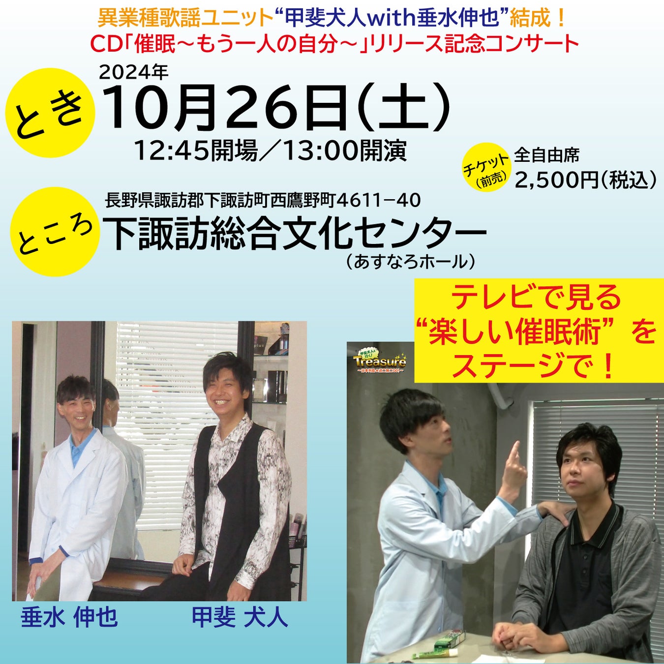 “甲斐犬人with垂水伸也”ファーストシングルCD「催眠~もう一人の自分~」(RQCD-10007/税込550円)全国CDリリースを記念して、甲斐犬人の出身地である長野県諏訪郡下諏訪町:下諏訪総合文化センター(あすなろホール)に於いて、異業種歌謡ユニット“甲斐犬人with垂水伸也”結成!CD「催眠~もう一人の自分~」リリース記念コンサートを開催し、バラエティ系演歌・歌謡曲歌手の甲斐犬人と鍼灸師・柔整師・催眠術師の垂水伸也による異業種歌謡ユニットの息の合ったデュエット曲「催眠~もう一人の自分~」をステージで初披露させて頂きます。