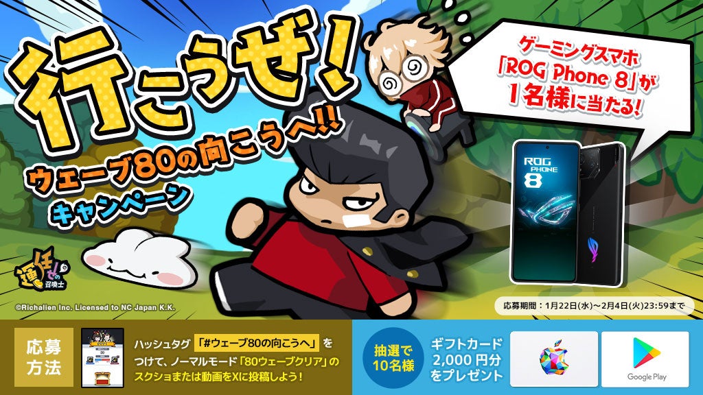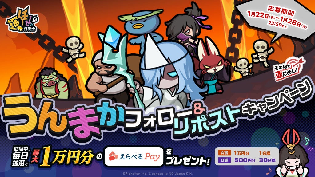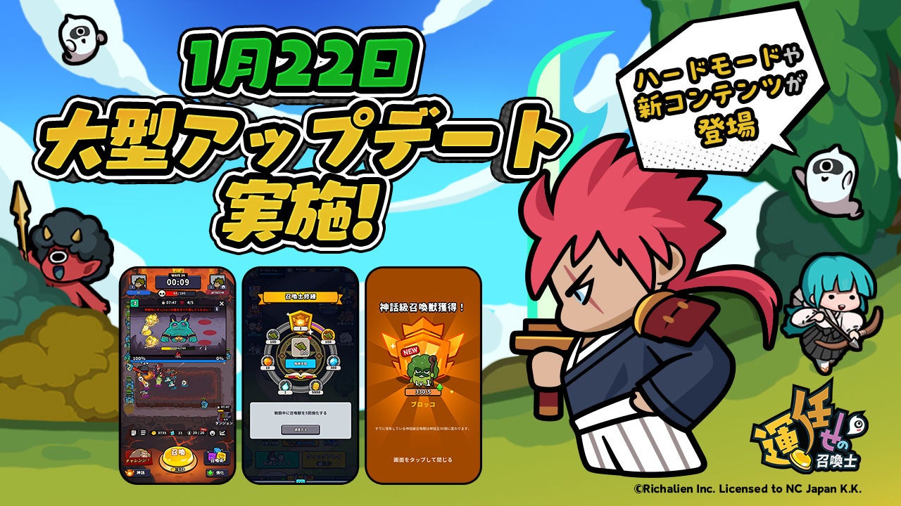 エヌ・シー・ジャパン株式会社(本社:東京都港区、代表取締役:林元基(イムウォンキ)、以下エヌシージャパン)は、カジュアルタワーディフェンスゲーム「運任せの召喚士」に関して、本日1月22日(水)にアップデートの実施、および各種キャンペーンの開催をお知らせします。