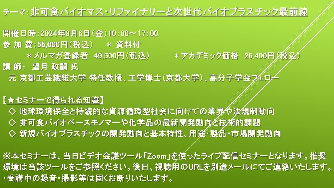 【ライブ配信セミナー】非可食バイオマス・リファイナリーと次世代バイオプラスチック最前線 9月6日(金)開催 主催:(株)シーエムシー・リサーチ