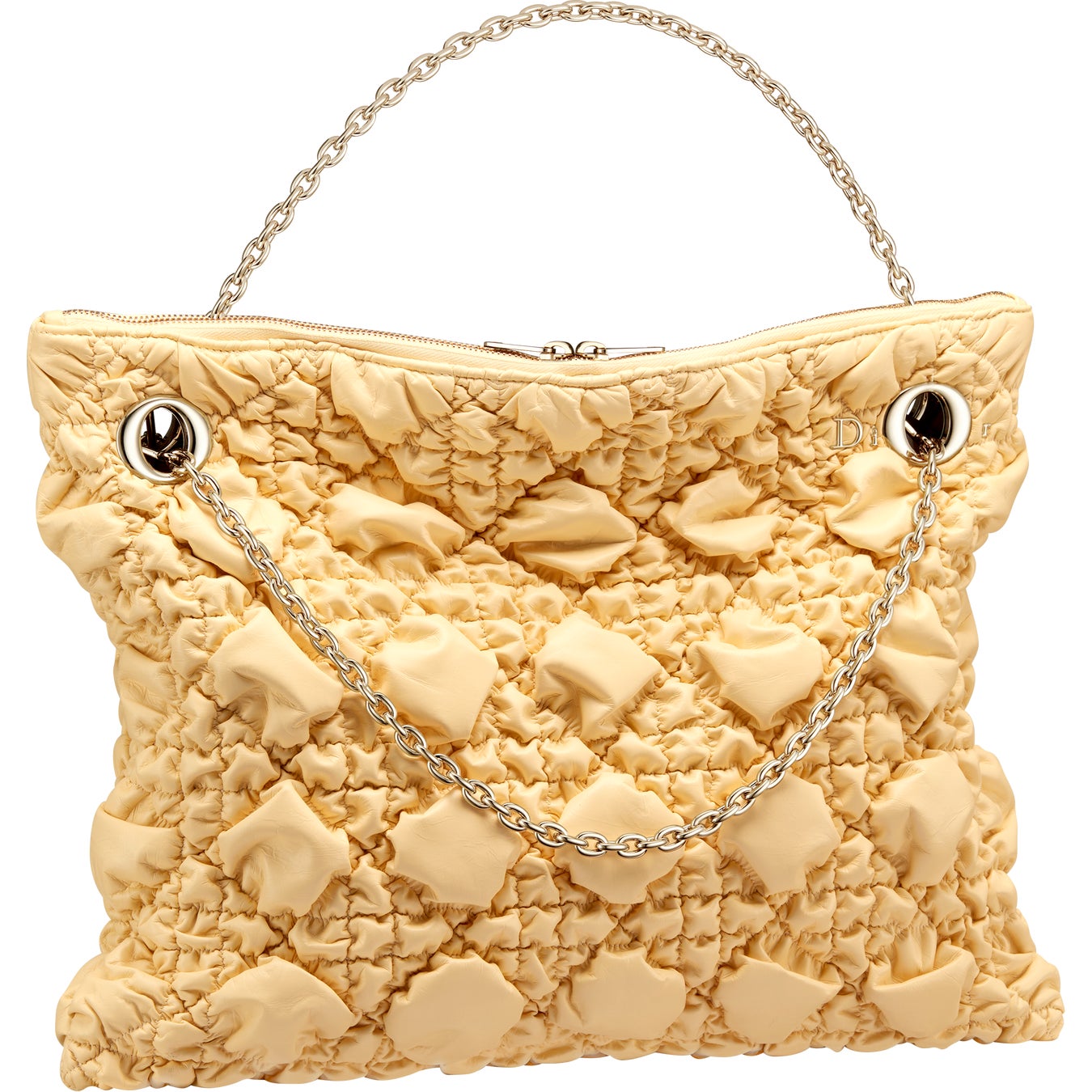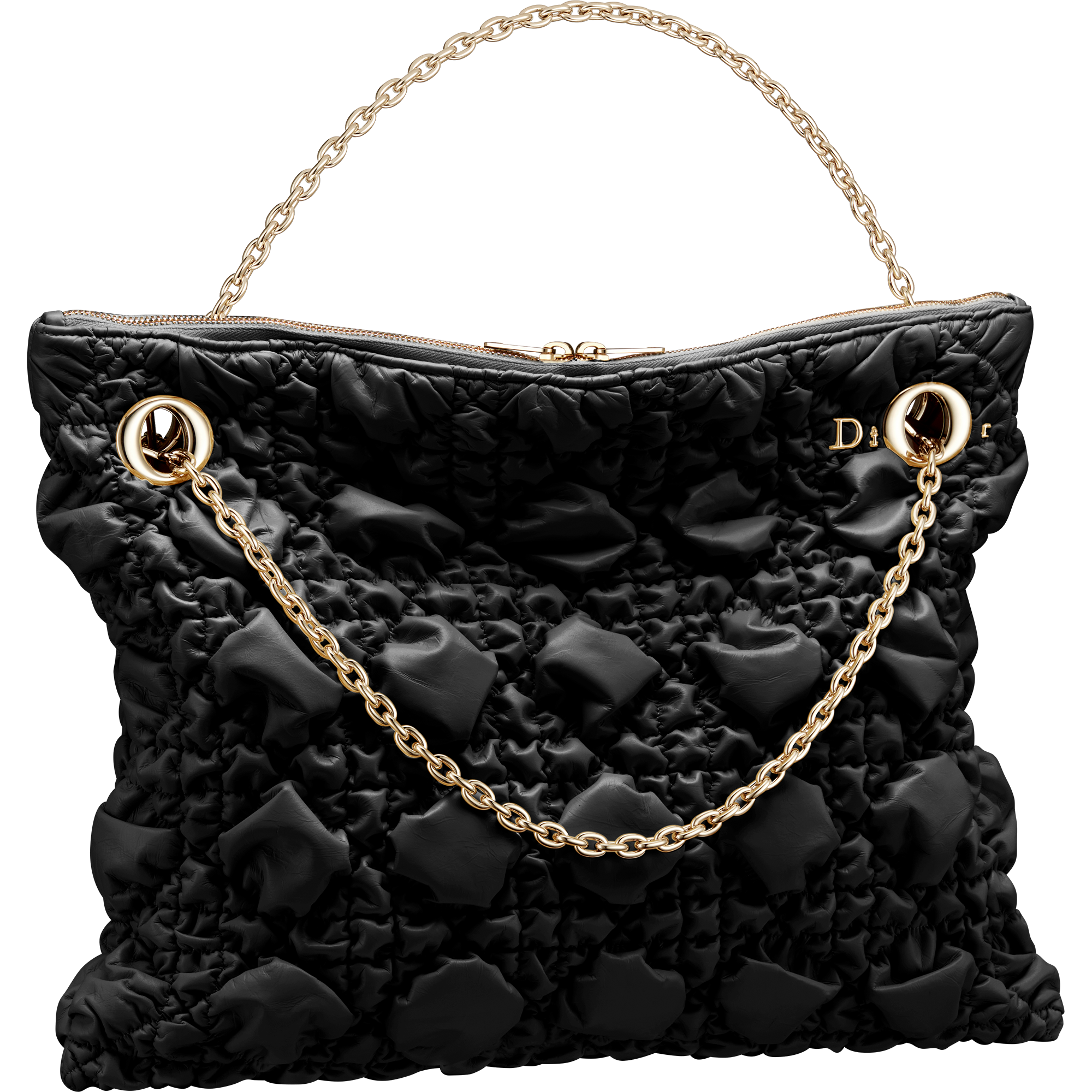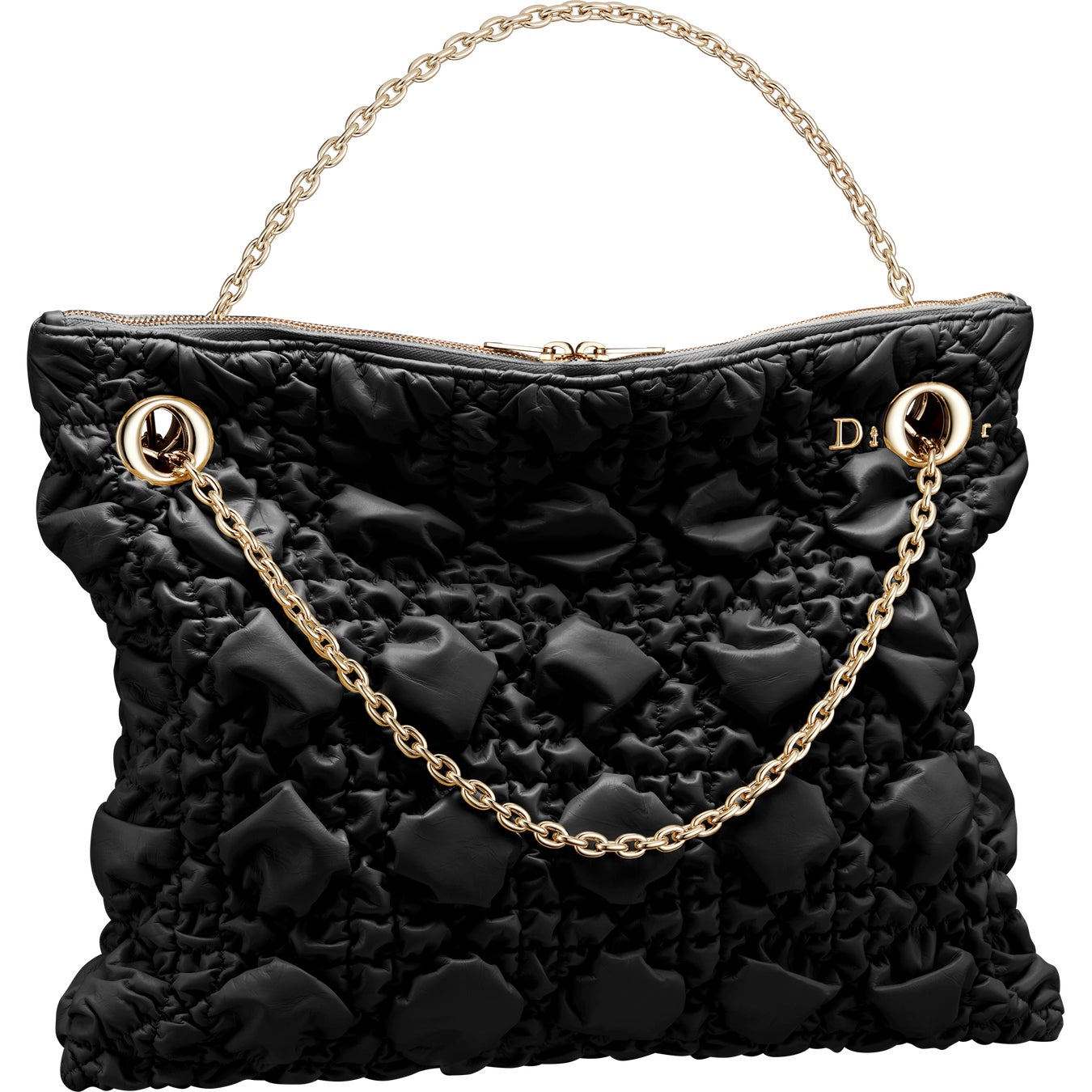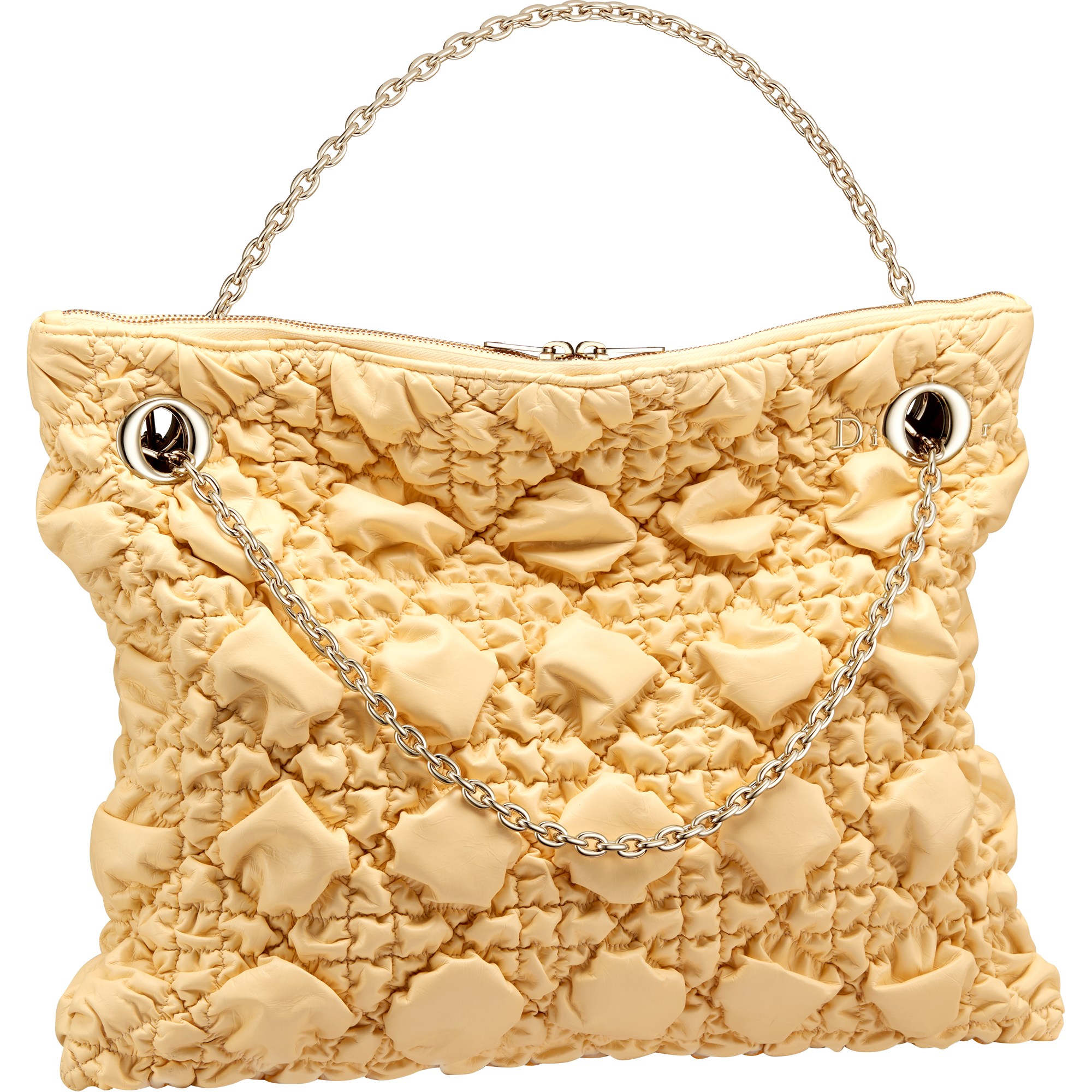 実用性と洗練を融合した「ディオール クランチー」は、手持ちや肩掛け、クロスボディといった様々な持ち方に対応する2つのゴールドハンドルを備え、あらゆる動きにフィットします。また、繊細な“Dior”シグネチャーがチェーンストラップのアイレットと戯れるデザインも特徴です。