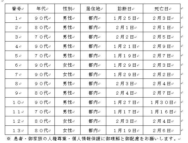 都内で新型コロナウイルスに感染した方が死亡されましたのでお知らせします。