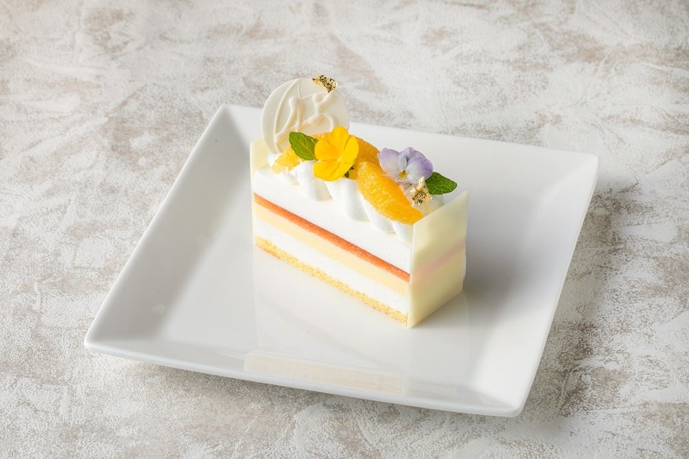 パティシエ特製の45周年記念ケーキは、オレンジ・レモン・グレープフルーツルビー・パッションの4種類のフルーツを使用した5層のムースで構成し、45の数字のホワイトチョコとホテルのイメージカラーであるオレンジを飾り華やかに仕上げました。