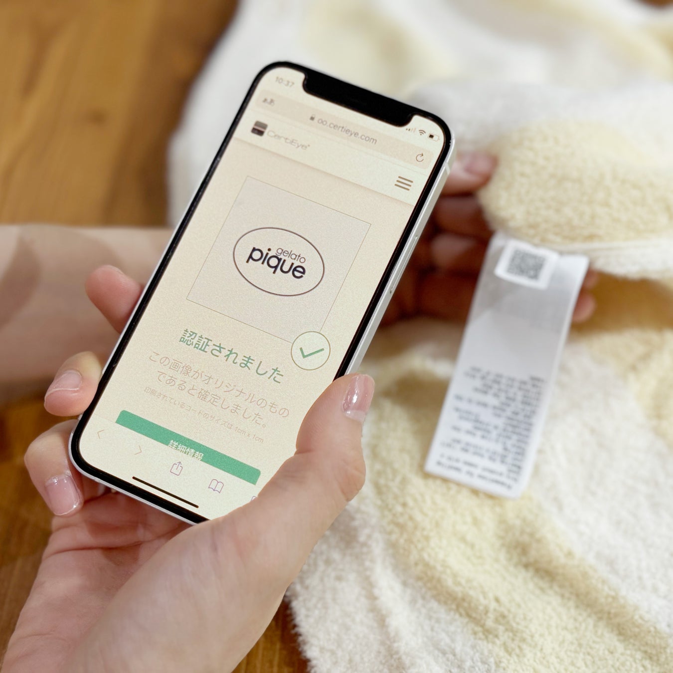 偽造防止セキュリティシステム『サーティアイ』は、製品本体に縫い付けられた2次元コードをサーティアイ公式アプリで読み込むことで、その場で真贋鑑定が可能となります。