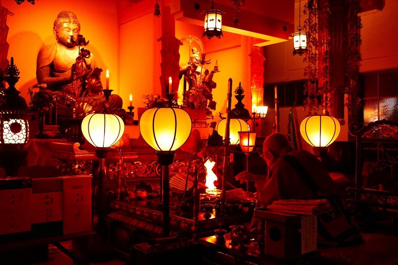 運慶作の国宝・五佛の前で護摩木を焚き上げ、煩悩を焼き払い、