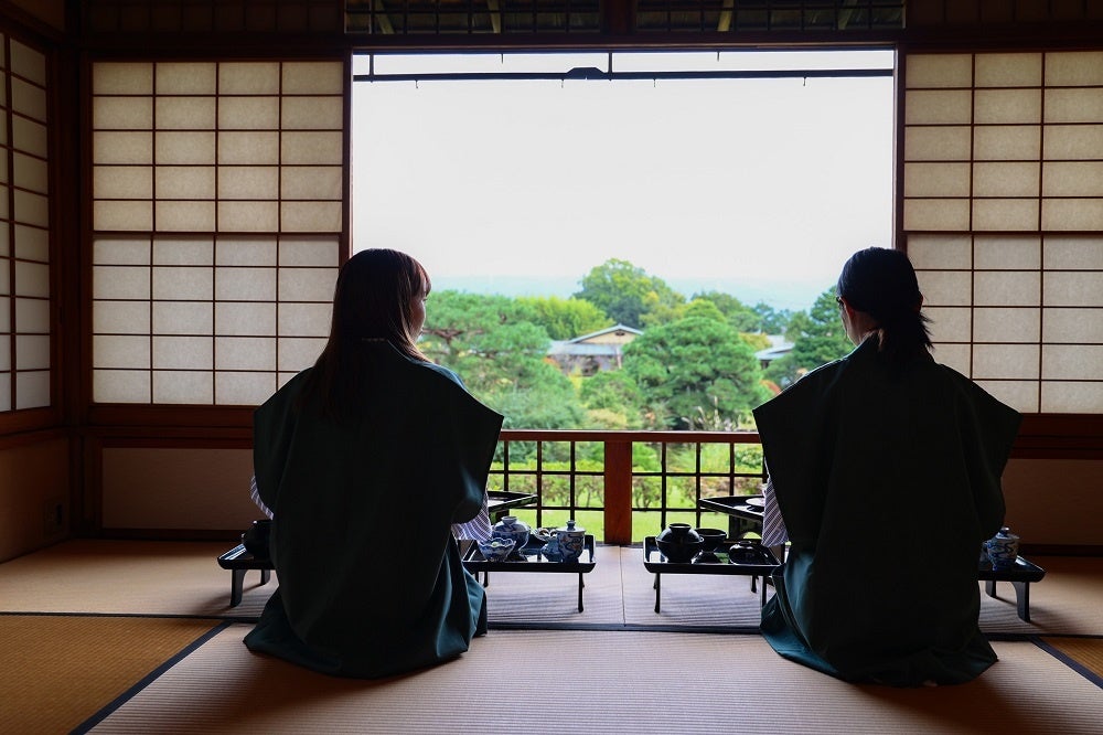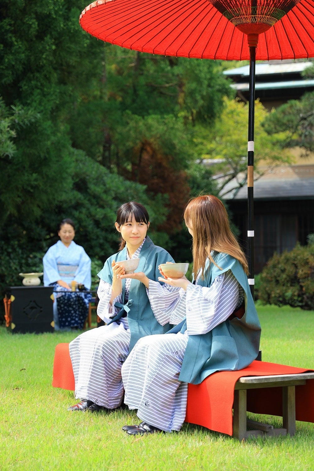 日本庭園にて、立礼式の抹茶体験をお楽しみいただけます。静寂な庭園の美しい景色を眺めながら、天空の抹茶®を一服。