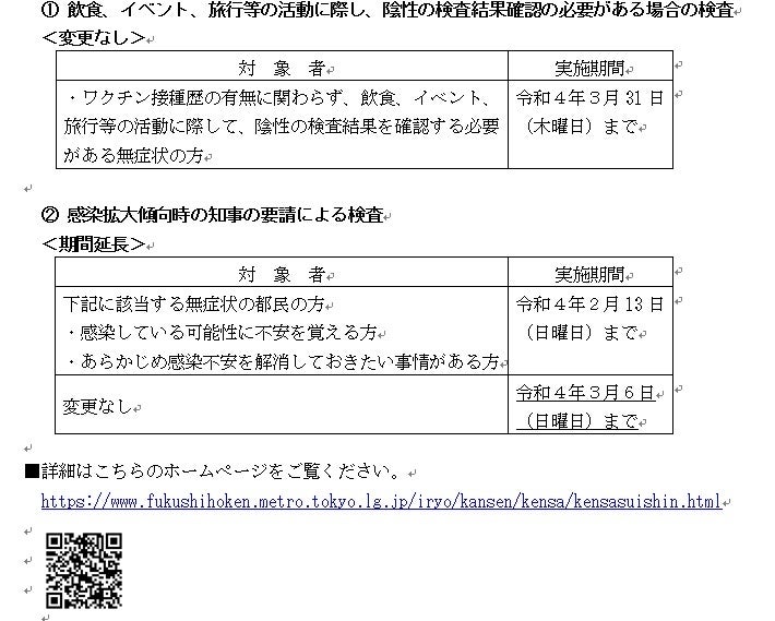 感染リスクが高い環境にあるなど、感染不安を感じる無症状の都民を対象としたPCR等検査無料化事業の実施期間を延長します