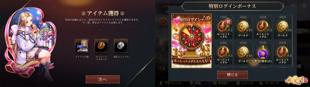 また、「メイファ:バレンタインver」、「メイシン:バレンタインver」、「一条 凪:バレンタインver」、「高柳 舞:バレンタインver」以外の「メイファ」、「メイシン」、「一条 凪」、「高柳 舞」シリーズのアバターを収集設定した場合、対局報酬で獲得できるルーレットメダルの数は通常の2倍に増加します。
