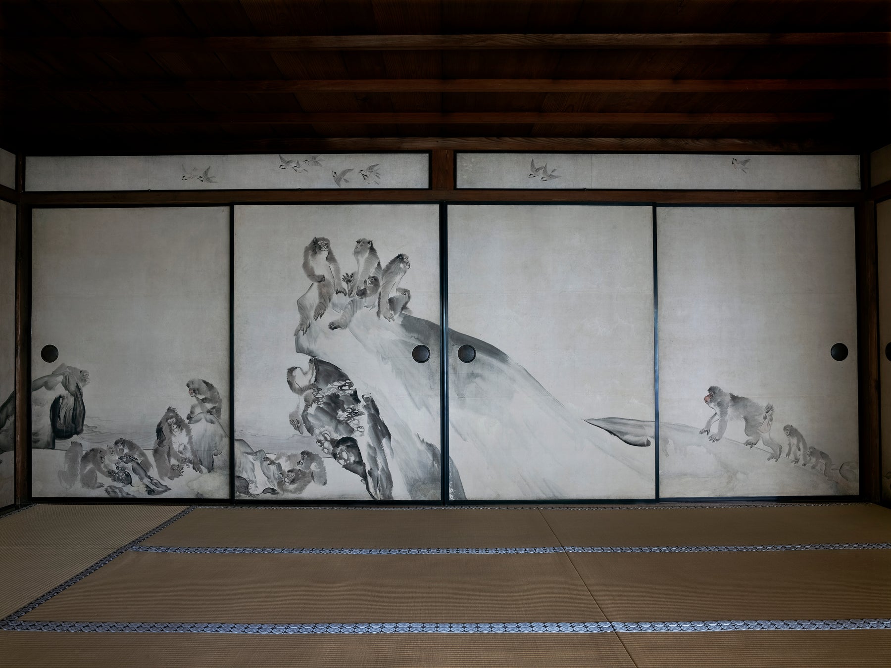 本展覧会に登場する大乗寺客殿(兵庫県美方郡香住町)は、江戸時代に活躍した絵師・円山応挙とその一門による数多くの障壁画が残されていることから、別名「応挙寺」と呼ばれています。客殿の障壁画は計算しつくされた配置により、立体的な曼荼羅を構成しているとも言われており、応挙は絵画の芸術的評価に加えて空間プロデューサーとしての側面も注目されています。