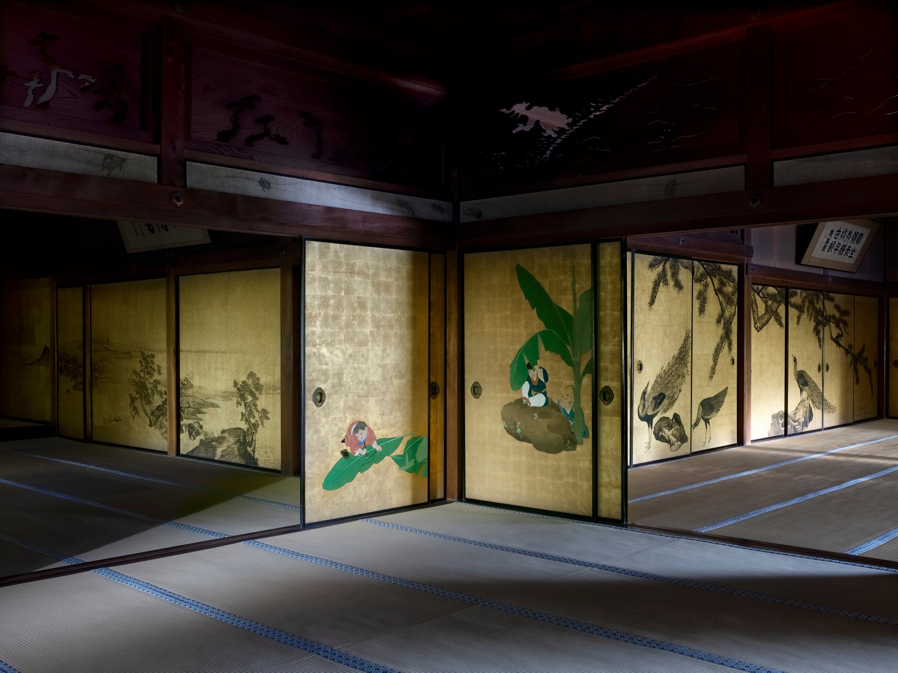 大乗寺客殿は、円山応挙とその一門によって描かれた障壁画による各部屋が世俗的な世界と神聖な世界とを仲介する一種の立体曼荼羅として知られています。建物中央に位置する仏間には、十一面観音像が設置され、仏間を囲む11の部屋と2階の2間の165面に及ぶ障壁画は、それぞれの部屋のストーリーと機能性を併せもつ連続的な空間性に卓越した特徴があります。