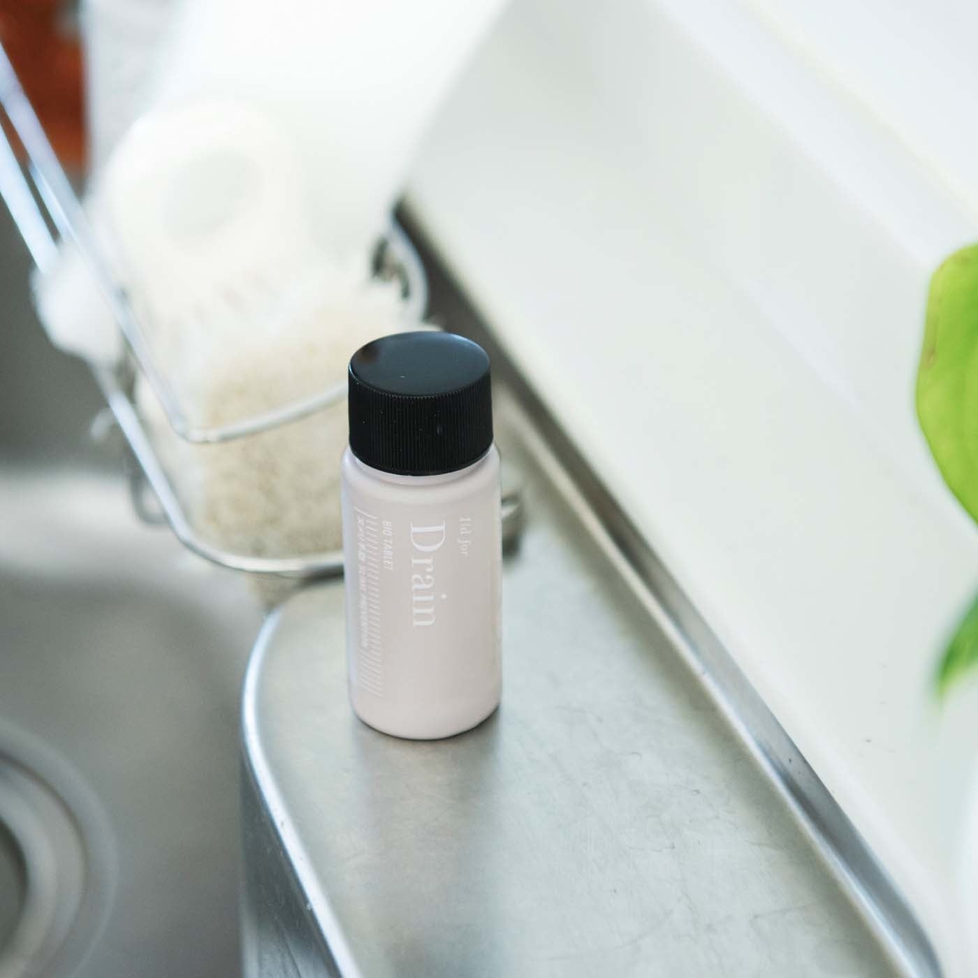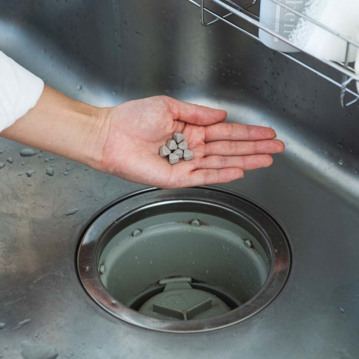 週に1回、7粒を排水口に投入します。塩素や界面活性剤などの化学薬品は不使用なので食品を扱うキッチンでも安心です。