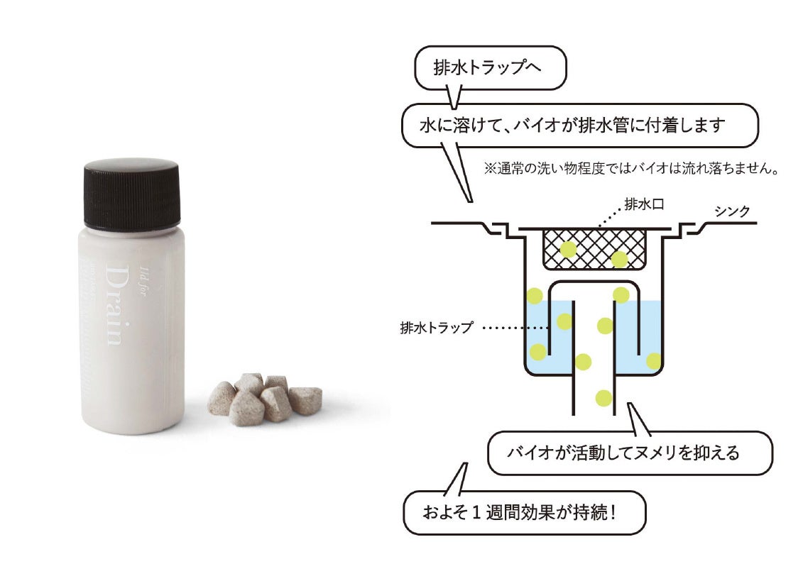週1ケアで排水口のきれいを保つヌメリ予防剤です。排水口に投入し、水にふれることで、バイオ(有用微生物)が動き出し、ヌメリやヌメリによるにおいの発生を予防します。