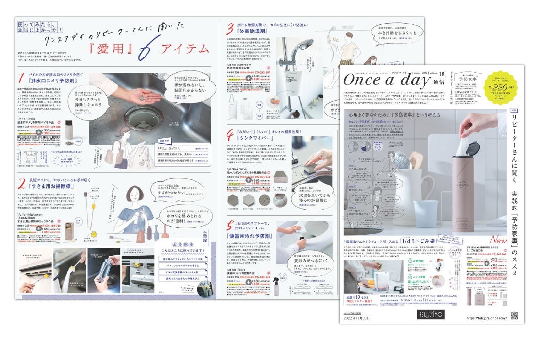 ついサボりがちになる作業ですが、「Once a day」では、家事を続けることが楽しくなるような仕掛けを持った、便利で安全な暮らしの道具を届けることで、“予防家事®”を続けられるサポートをしています。